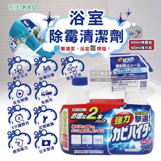 Kao 花王(1+1超值組)日本KAO花王-濃密泡沫強力除霉噴霧清潔劑400ml噴霧瓶+400ml補充瓶(浴室矽利康廁所磁磚縫隙清潔劑淋浴軟管除水垢家用鹼性清潔劑強力拔除霉根藍色按壓瓶)