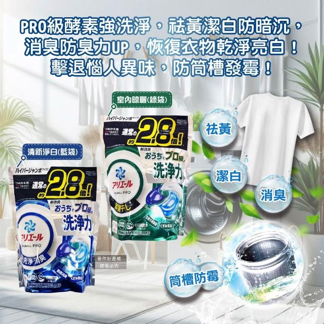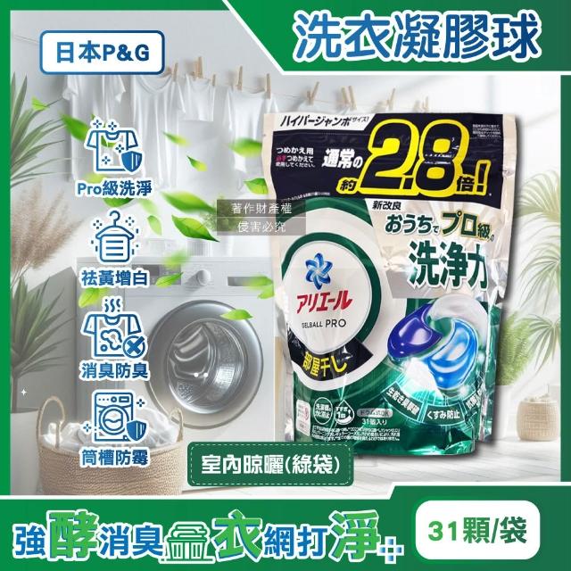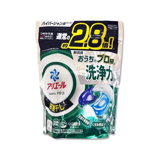 ARIEL日本P&G-Ariel PRO級酵素強洗淨洗衣球-室內晾曬31顆/綠袋(家庭號補充包去黃亮白洗衣凝膠球筒槽防霉洗衣膠囊直立/滾筒式洗衣機皆適用)