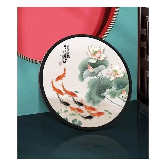 九魚圖玄關裝飾畫 九鯉魚風水招財壁畫 新中式荷花過道掛畫 圓形壁畫 實木框畫 美居生活屋