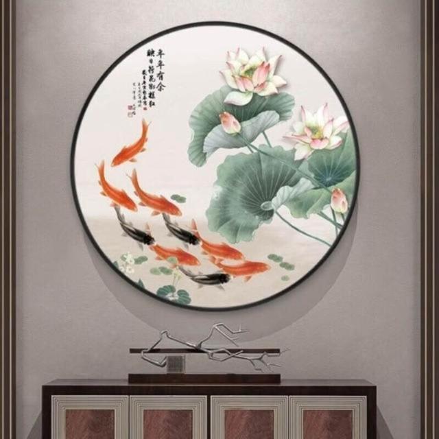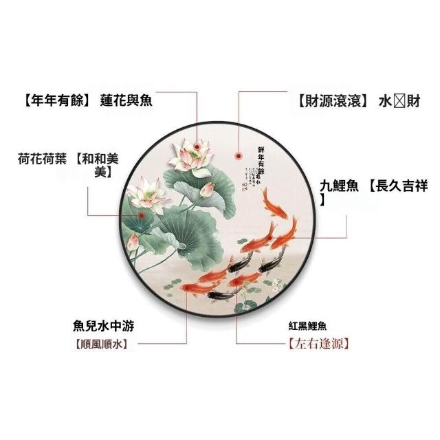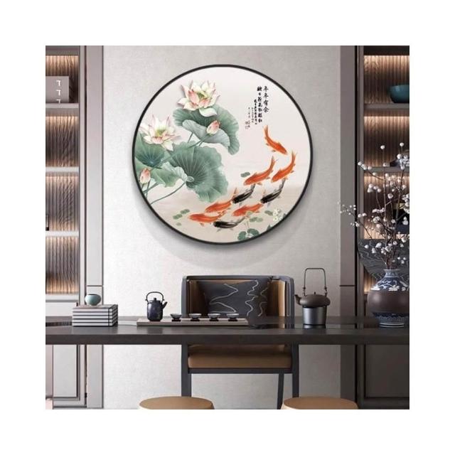 九魚圖玄關裝飾畫 九鯉魚風水招財壁畫 新中式荷花過道掛畫 圓形壁畫 實木框畫 美居生活屋