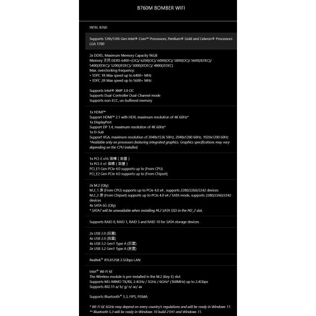 MSI 微星B760M BOMBER WIFI DDR5 主機板-註4