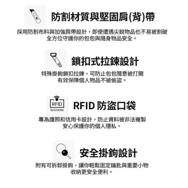- RFID阻隔暗袋,防止電子盜刷