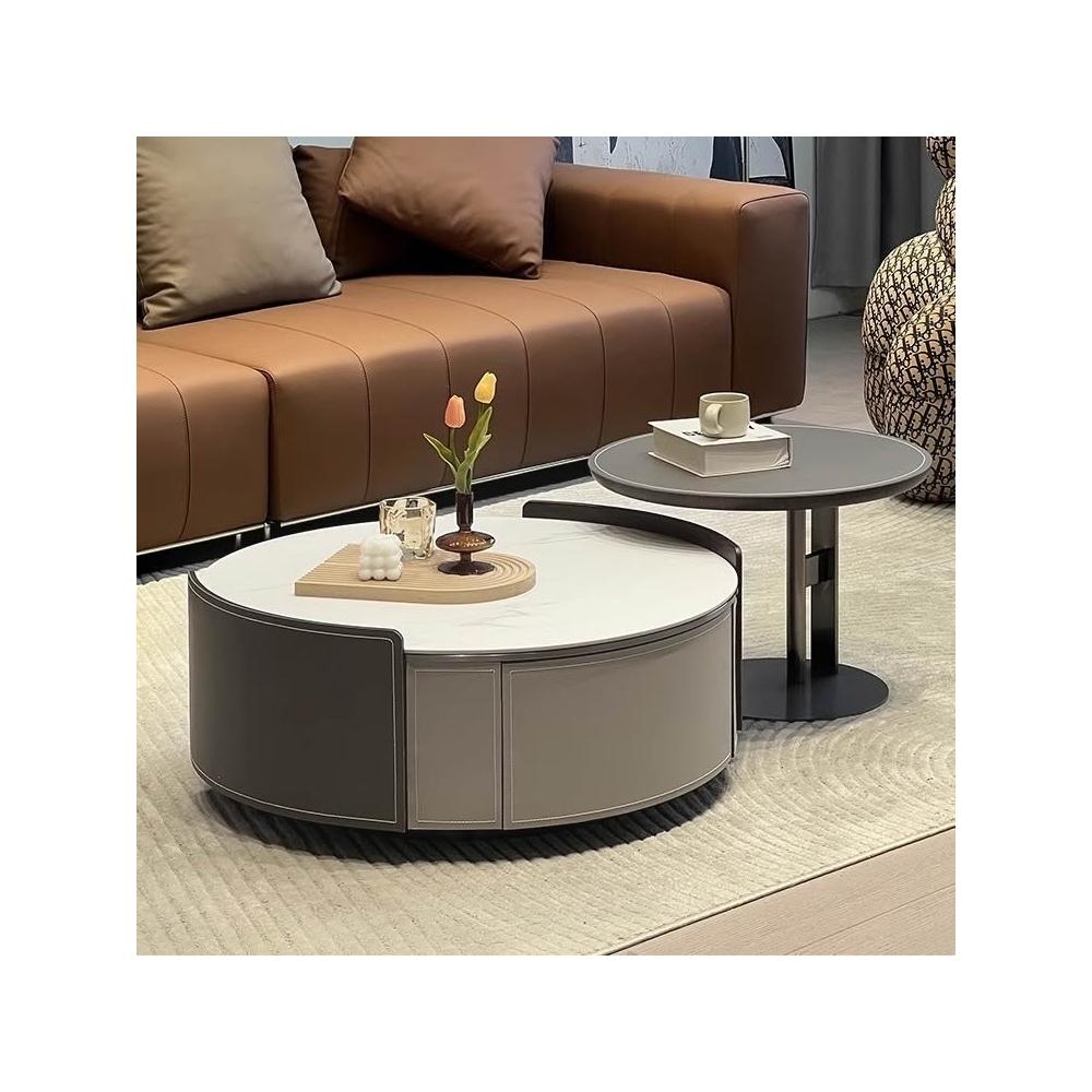 意式極簡馬鞍皮岩板圓形實木茶几小戶型客廳家用大小圓茶几桌組合