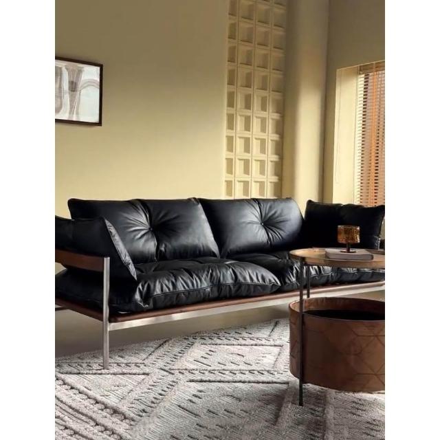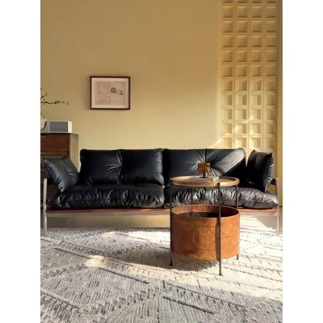 中古復古風黑色真皮沙發小戶型客廳包豪斯意式實木雲朵直排新款