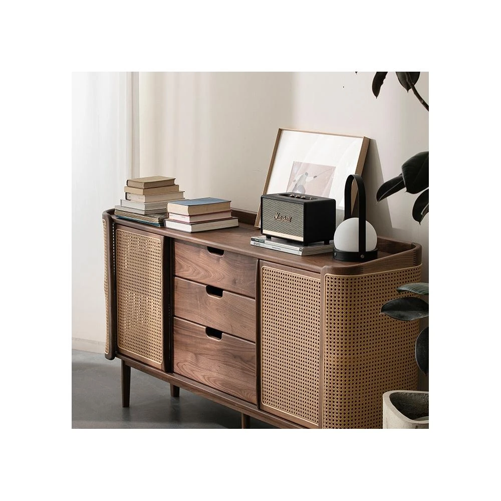 現貨 免運🔥黑胡桃木餐邊櫃儲物櫃藤編移門餐廳靠牆實木櫃儲物櫃多功能置物櫃