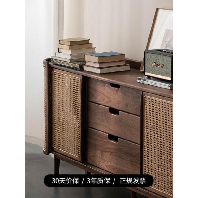 現貨 免運🔥黑胡桃木餐邊櫃儲物櫃藤編移門餐廳靠牆實木櫃儲物櫃多功能置物櫃