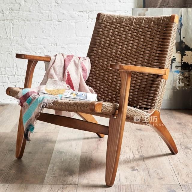 北歐實木藤編扶手椅傢用客廳陽臺靠背椅簡約單人沙髮椅懶人設計師