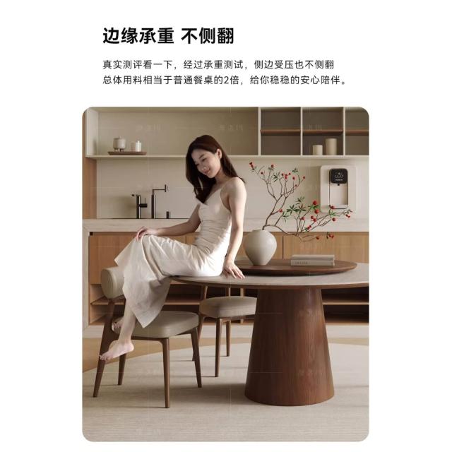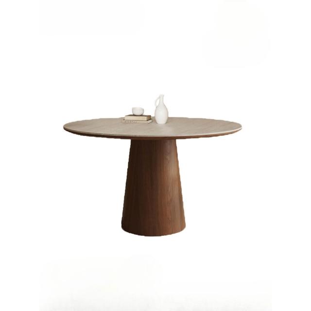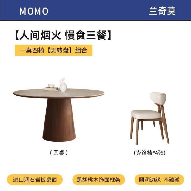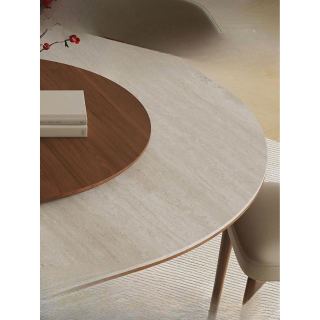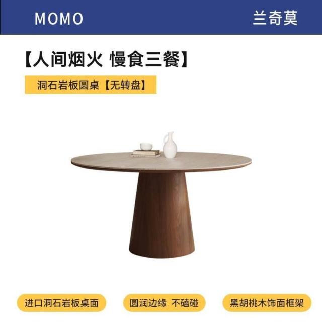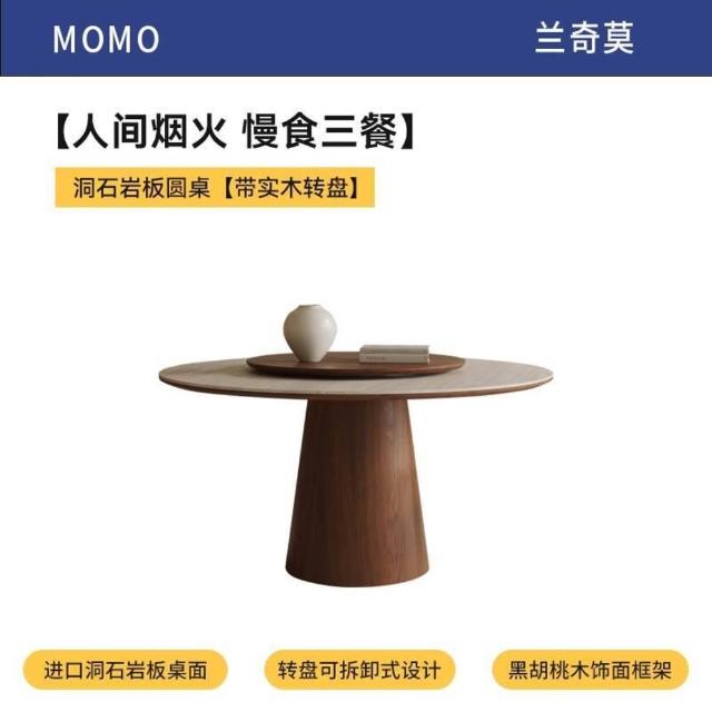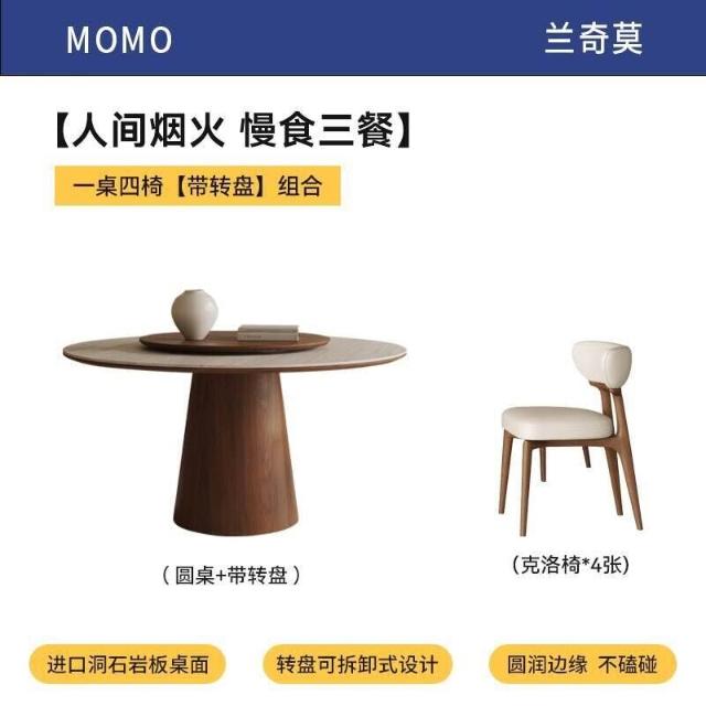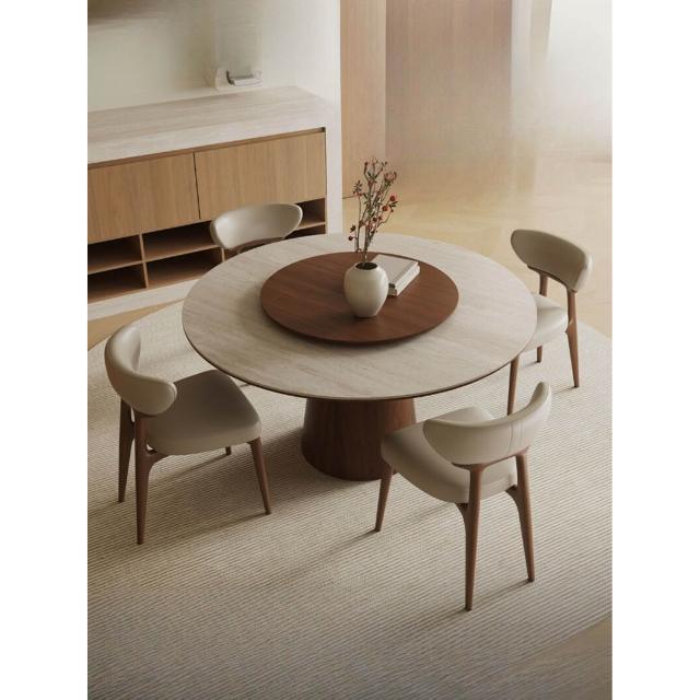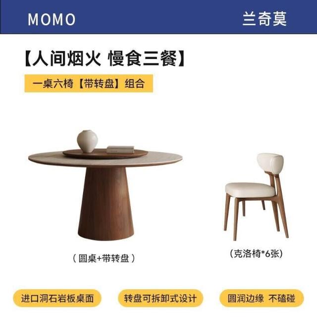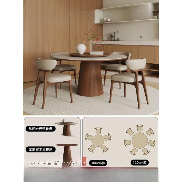 中古風洞石巖板圓桌家用小戶型飯桌椅組合6人圓形實木餐桌帶轉盤