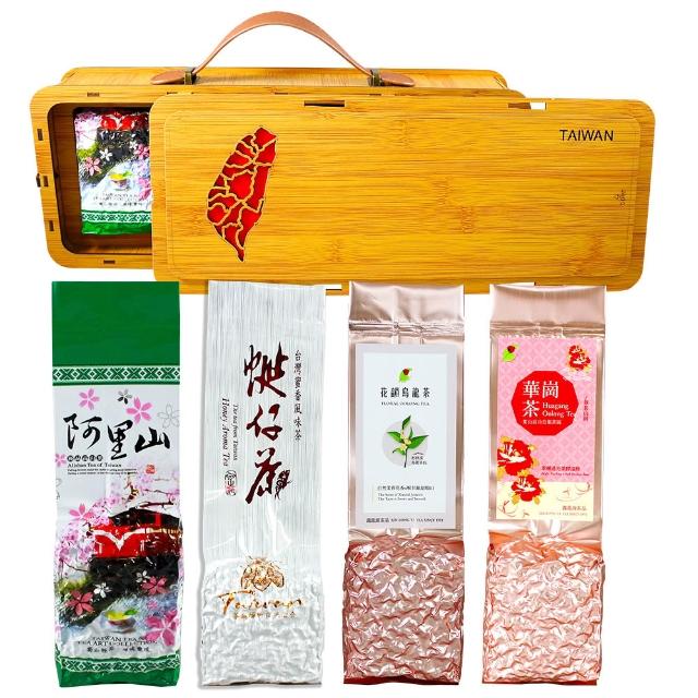 龍源茶品寶島台灣竹紋手提箱禮盒4入組-杉林溪蜒仔茶/阿里山花郁甘露/華崗茶梨山高冷烏龍/杉林溪花韻烏龍茶-任選附提袋