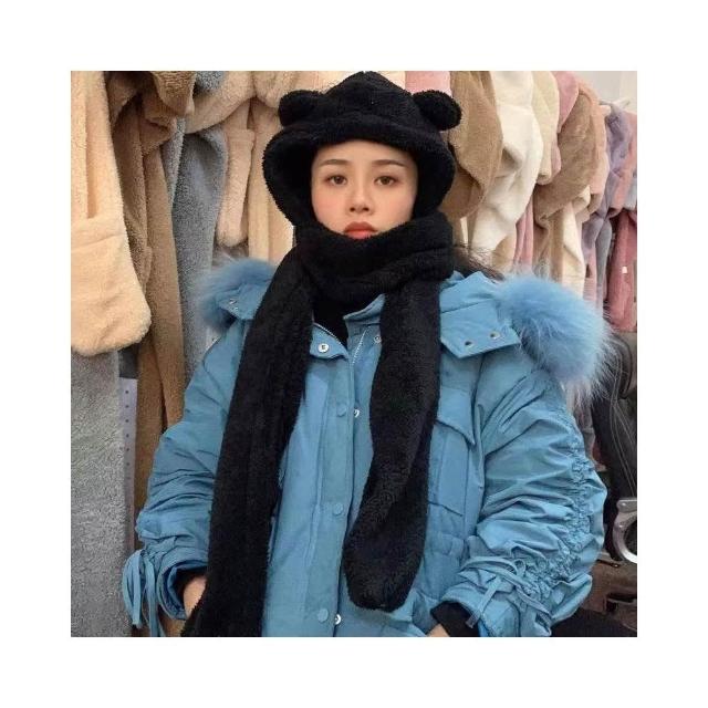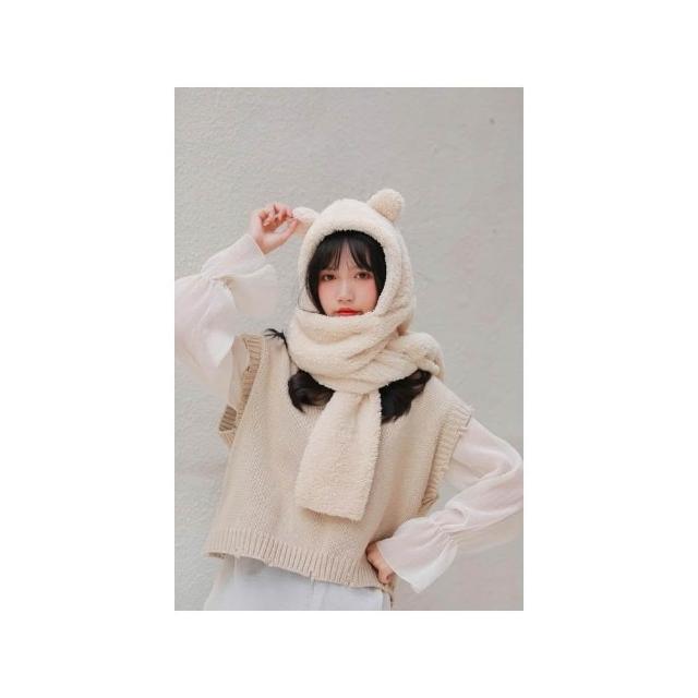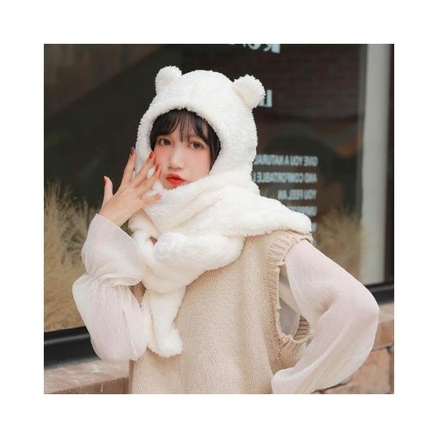 JMI 連帽小熊圍巾 可愛百搭毛絨圍巾 加厚絨毛圍巾 秋冬保暖圍巾圍脖 泰迪熊純色圍巾 熊寶寶圍巾