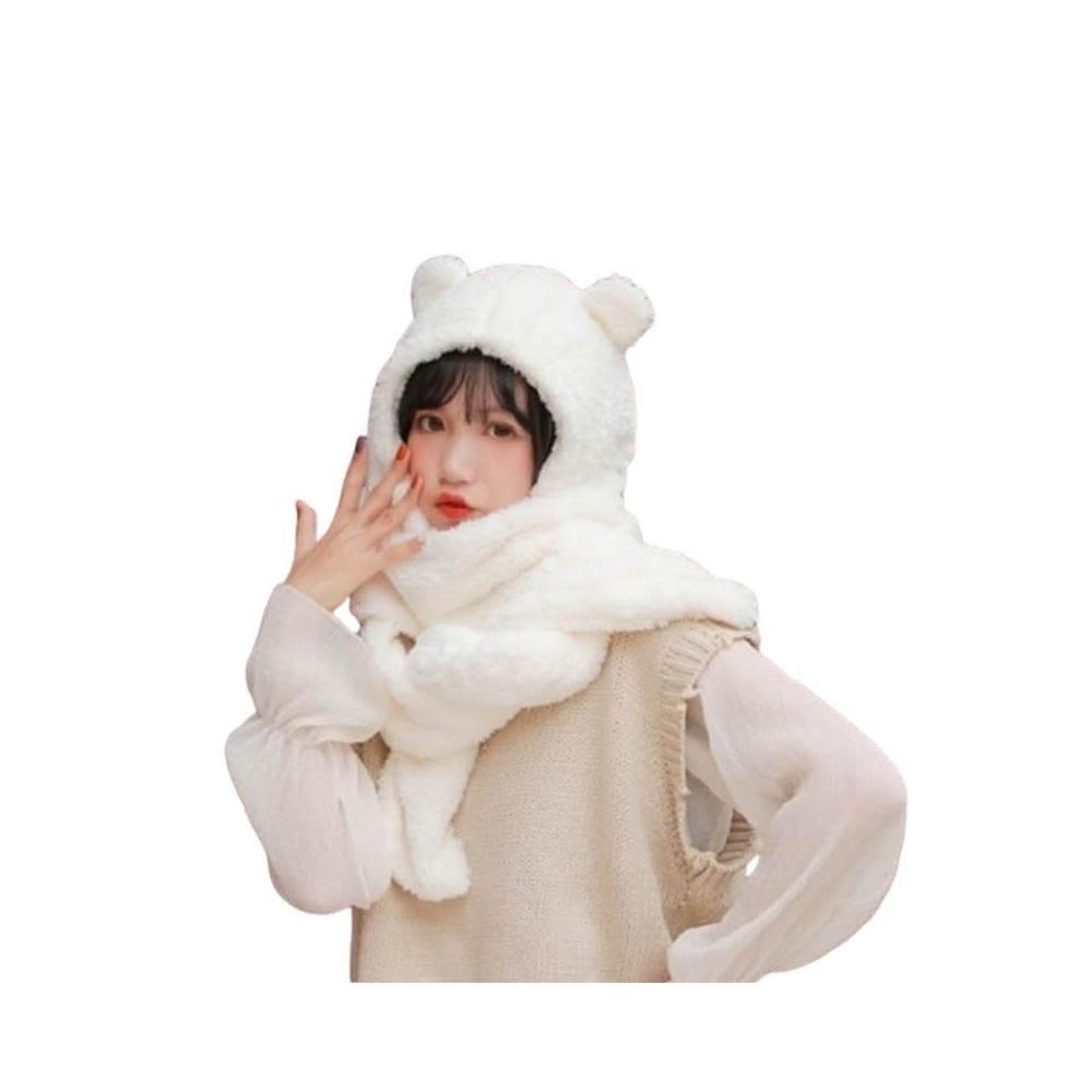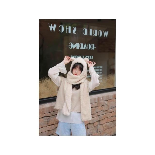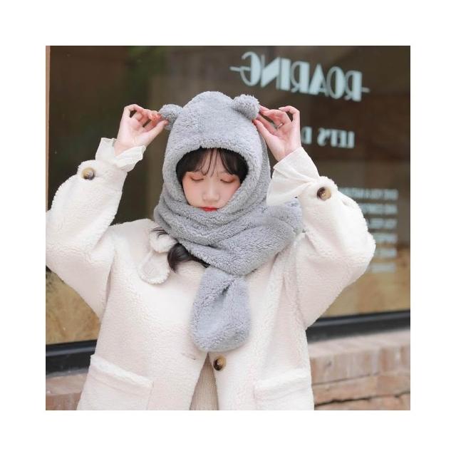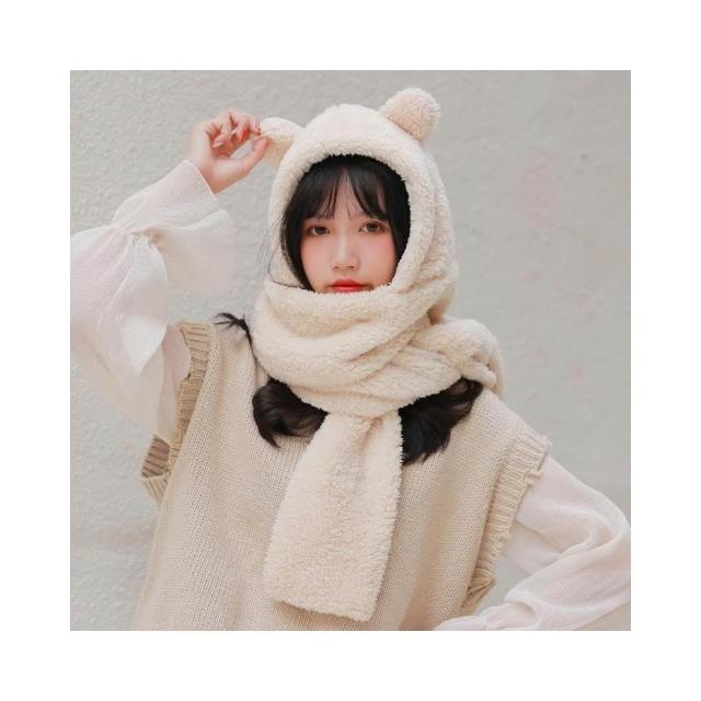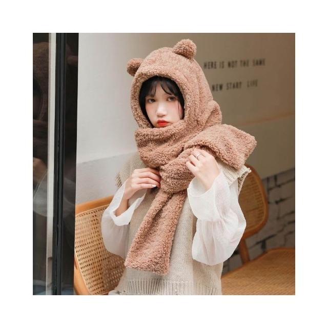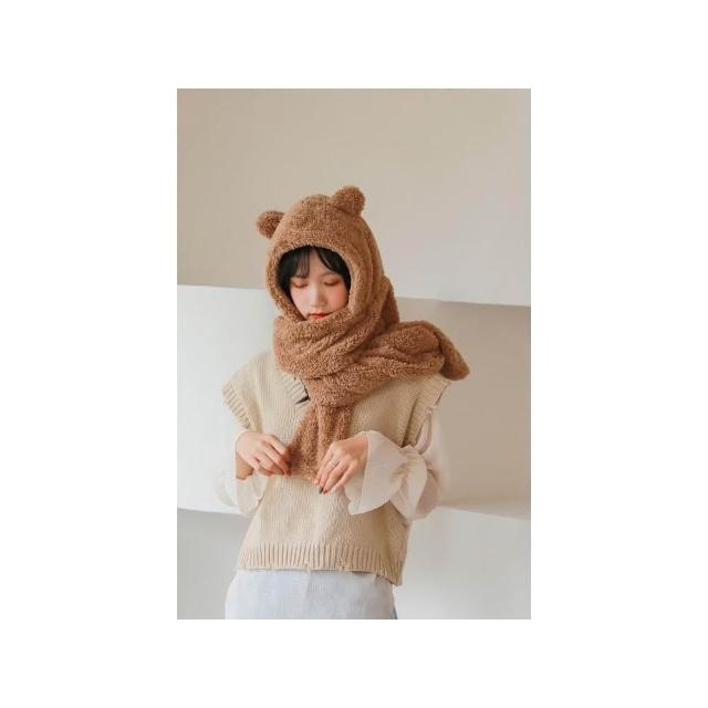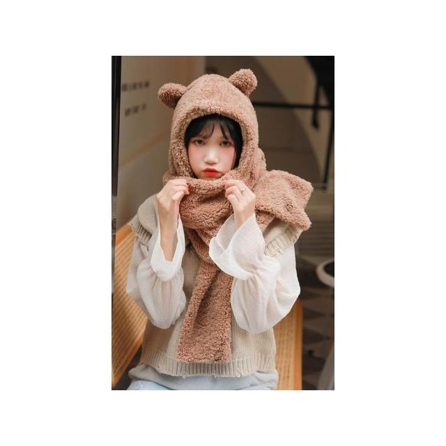 JMI 連帽小熊圍巾 可愛百搭毛絨圍巾 加厚絨毛圍巾 秋冬保暖圍巾圍脖 泰迪熊純色圍巾 熊寶寶圍巾