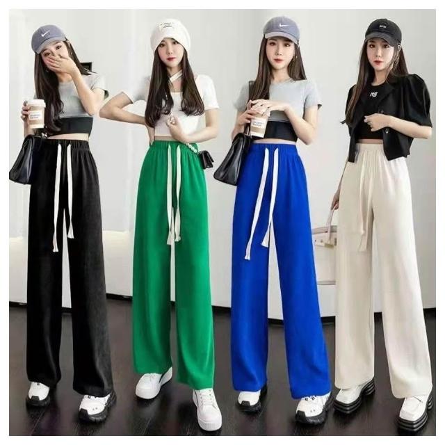 JMI 高腰抽繩條紋 直筒括腿褲 溜灣褲 高腰寬鬆重感休閒長褲 高腰褲 拖地褲 直筒褲