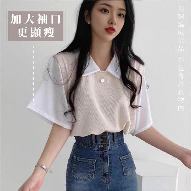 JMI 韓系學院風撞色POLO翻領假兩件短袖T 女休閒百搭上衣 背心短袖假兩件上衣 春季服飾 日系穿搭