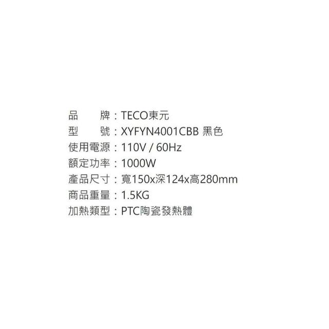 TECO 東元3D擬真火焰PTC陶瓷電暖器/暖氣機 XYFYN4001CBB 電暖器 暖氣機 電暖爐 暖爐