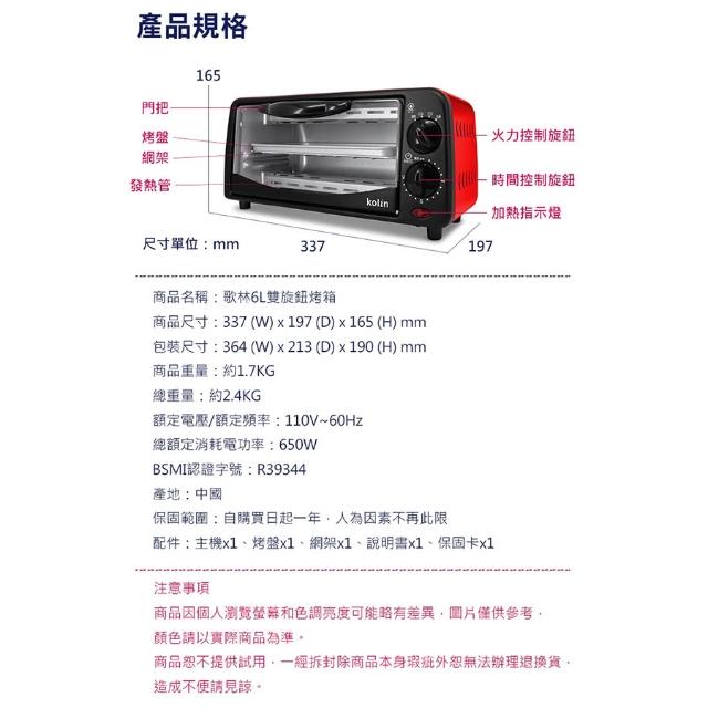 Kolin 歌林雙旋鈕控溫 6公升 烤箱 獨立上下火 電烤箱 小烤箱 KBO-SD1805