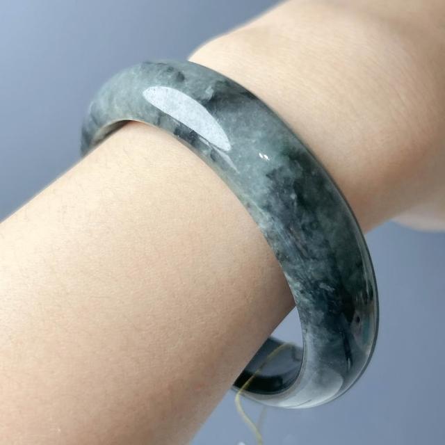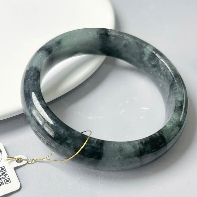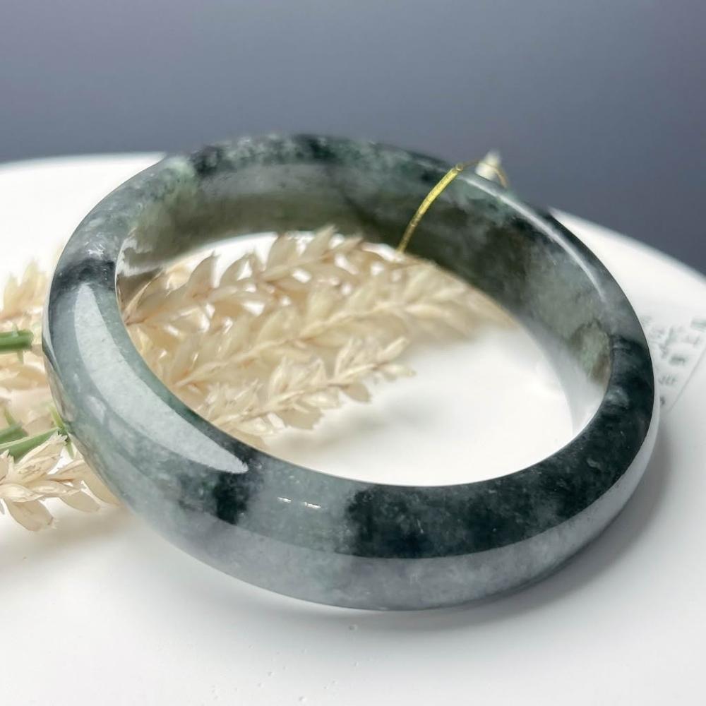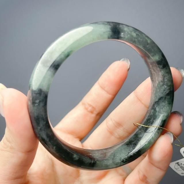 玉我翡翠綠底冰烏雞飄花鐲 57mm 附陸証 A13666 緬甸A貨翡翠 玉我翡翠