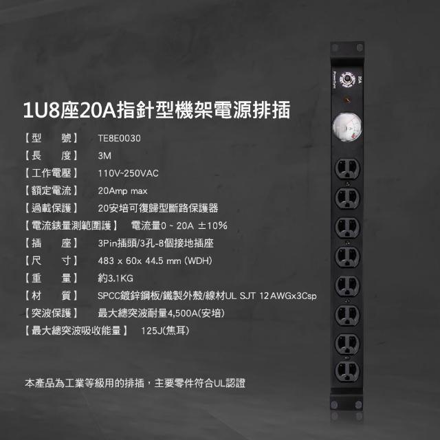 延長線 1U8座 20A指針型機架電源排插 PDU 3M 黑-TE8E0030