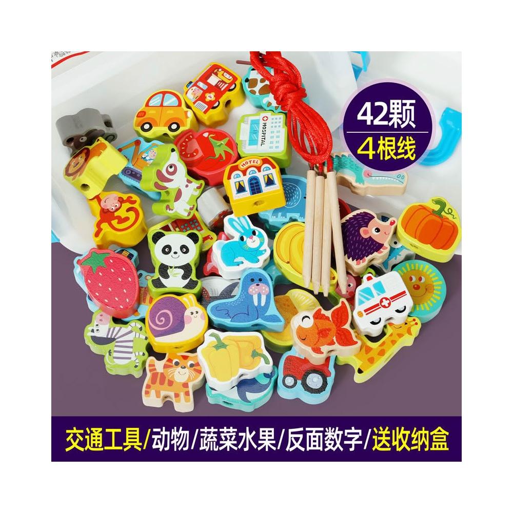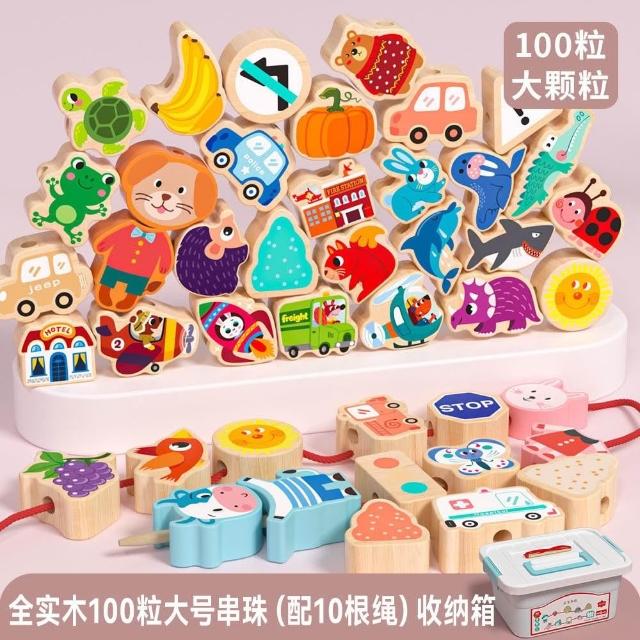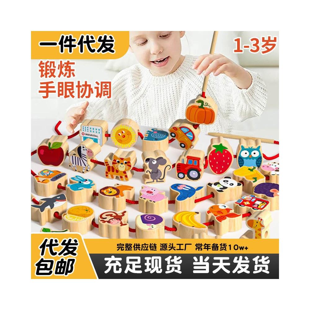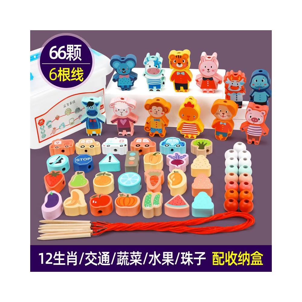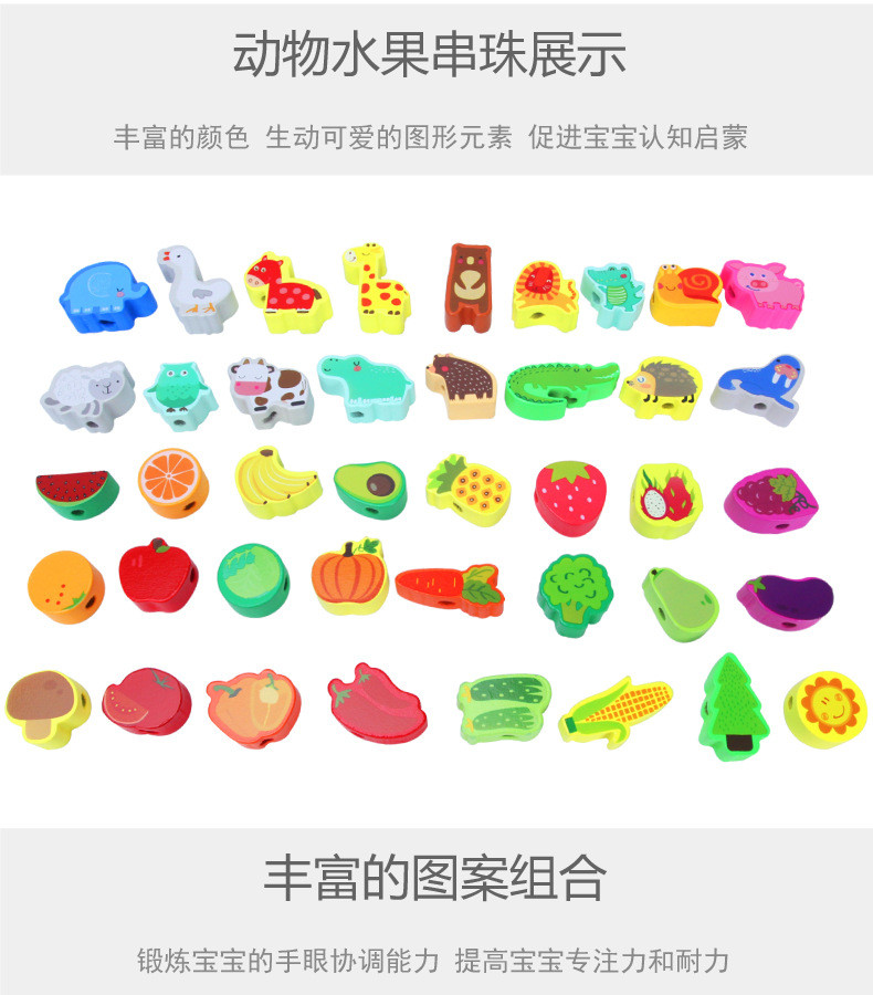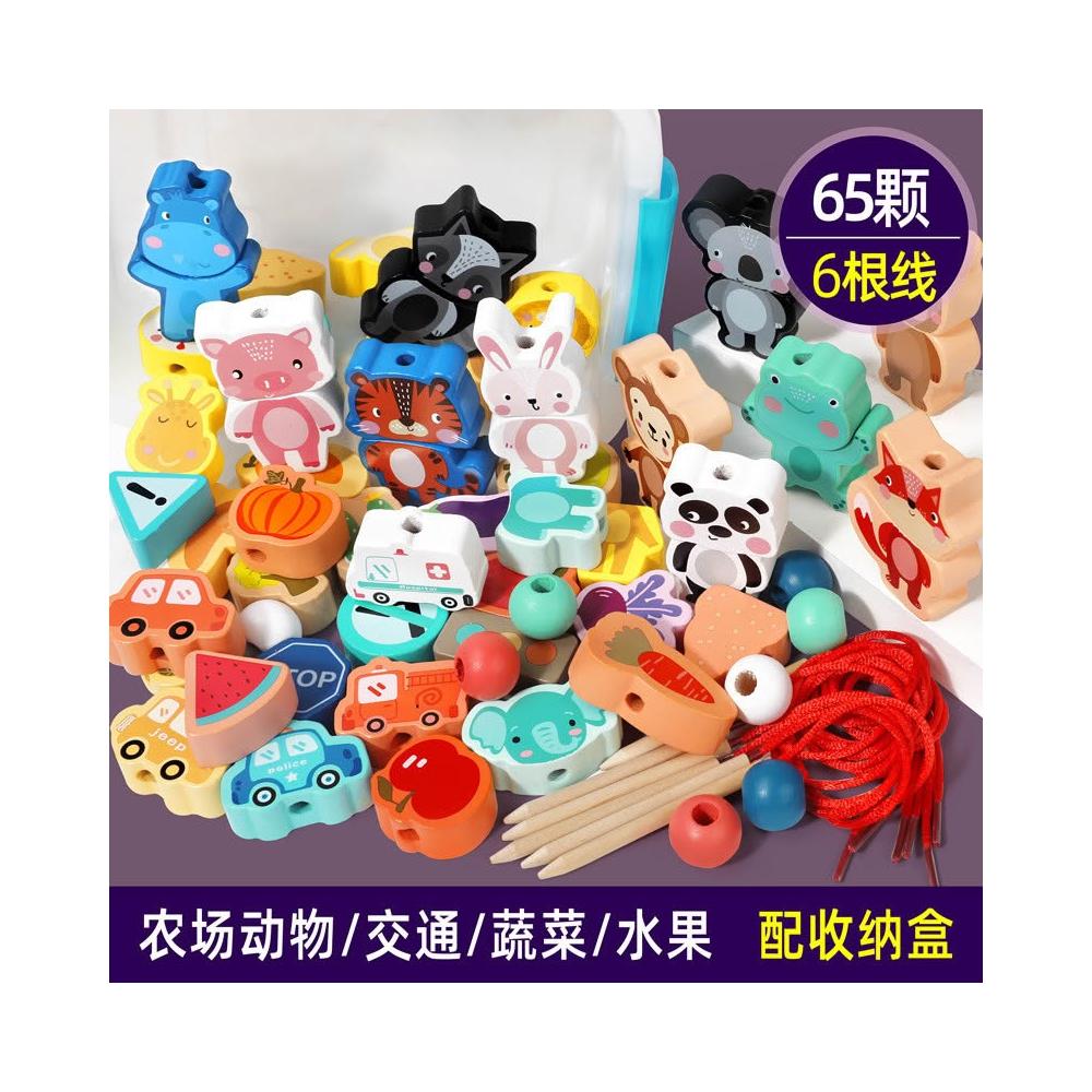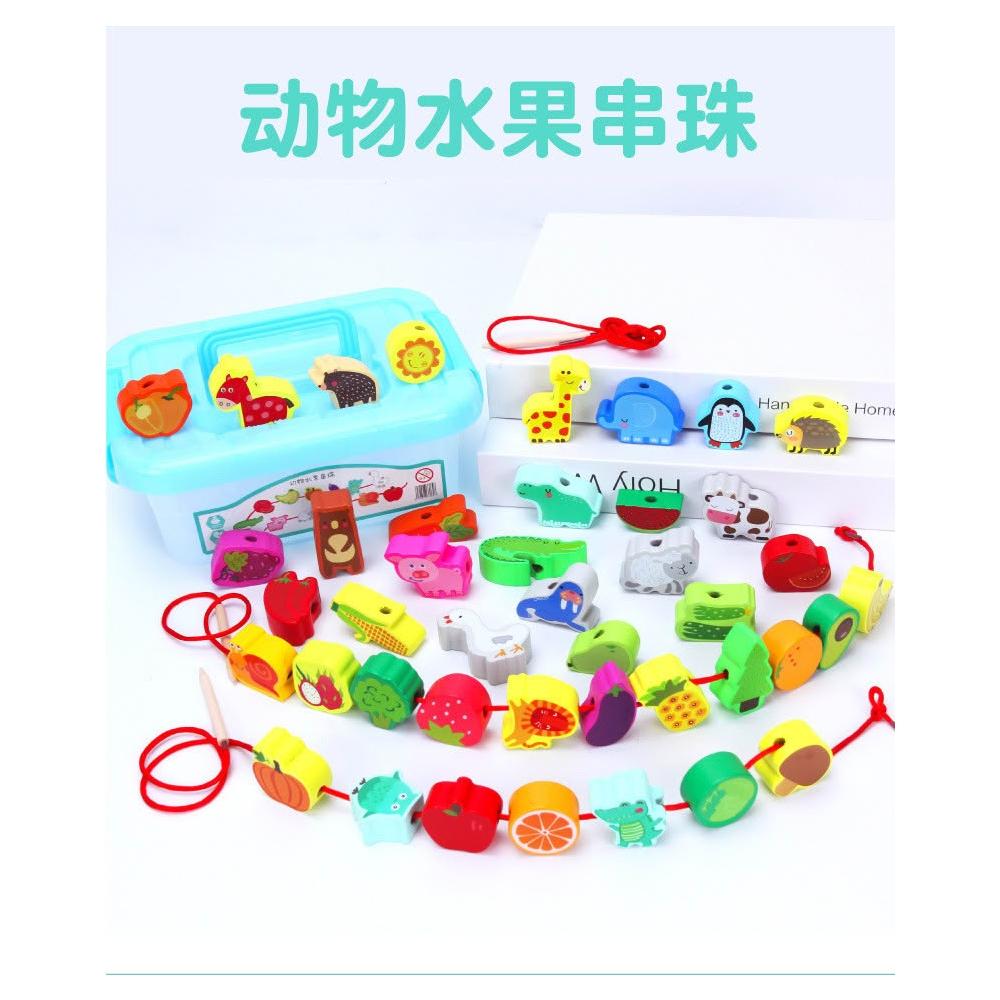兒童木製益智串珠大顆粒積木玩具動物水果穿繩串串珠益智玩具0-3