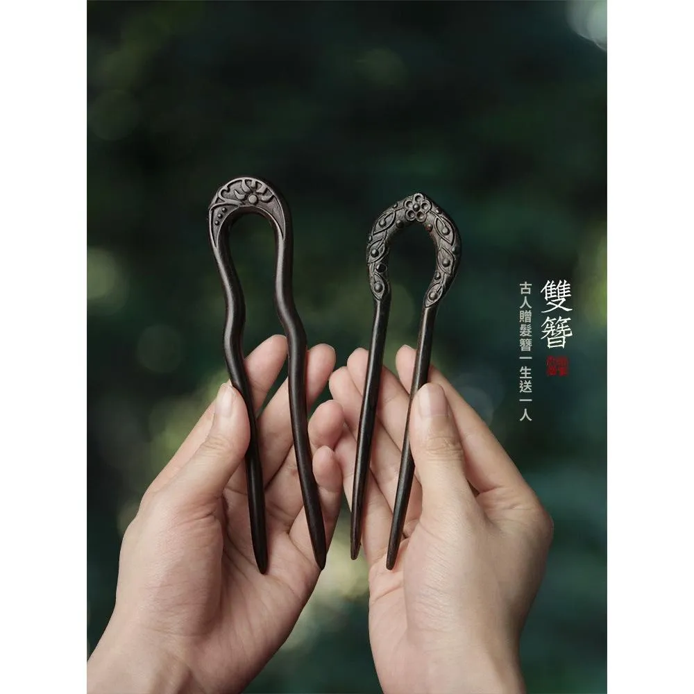 🎗飾間首飾鋪 黑檀木u型雙簪子女高級感髮釵子復古風簡約款髮簪日常挽髮頭飾品