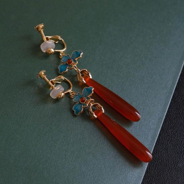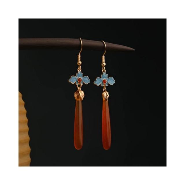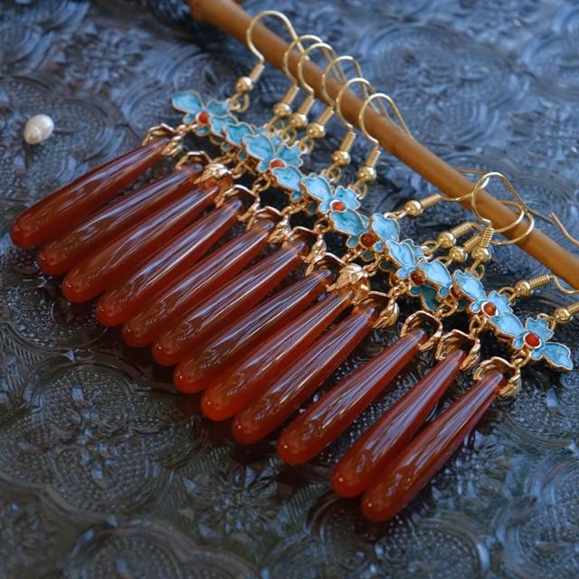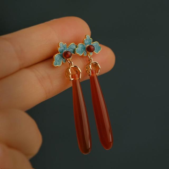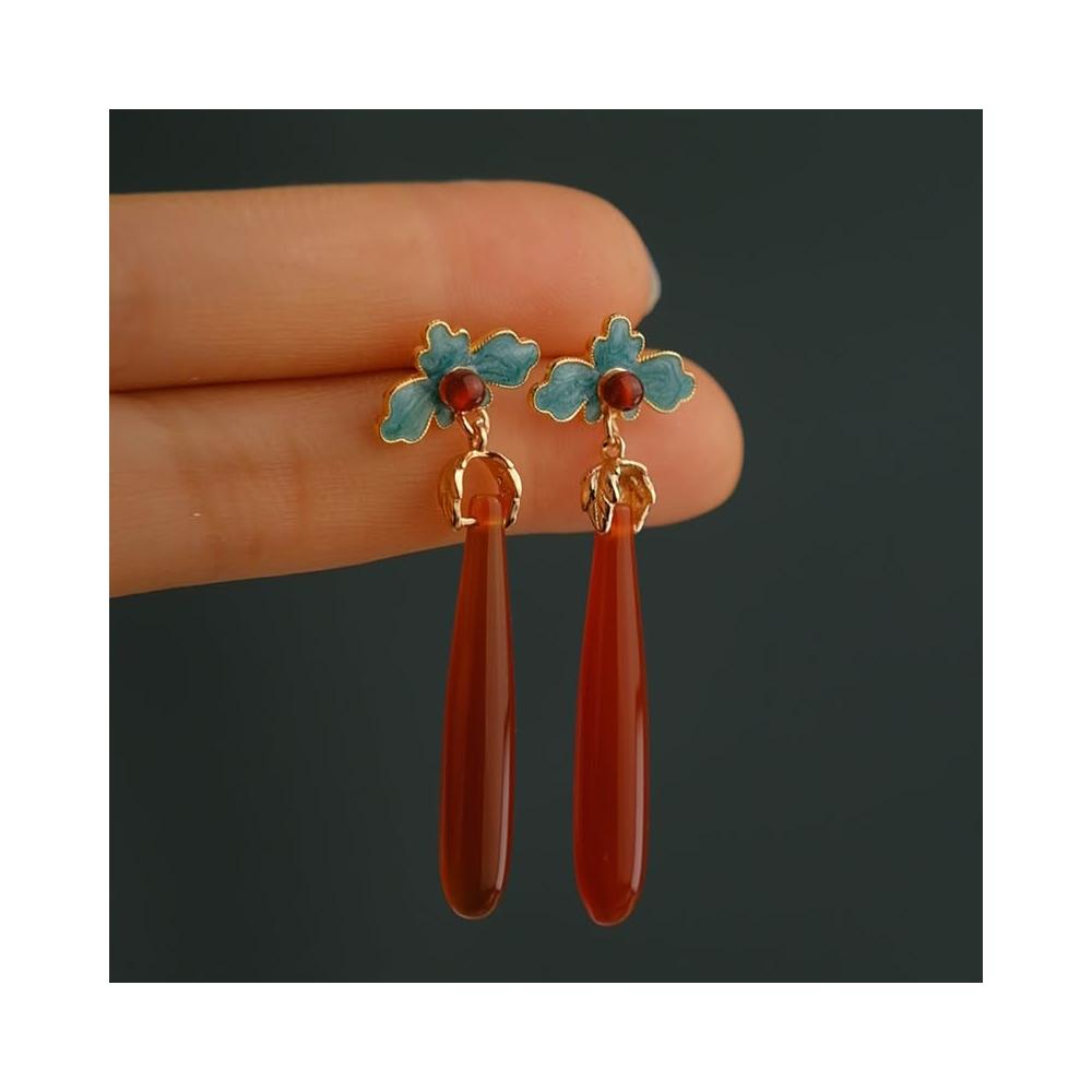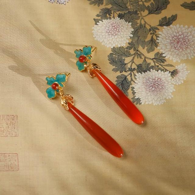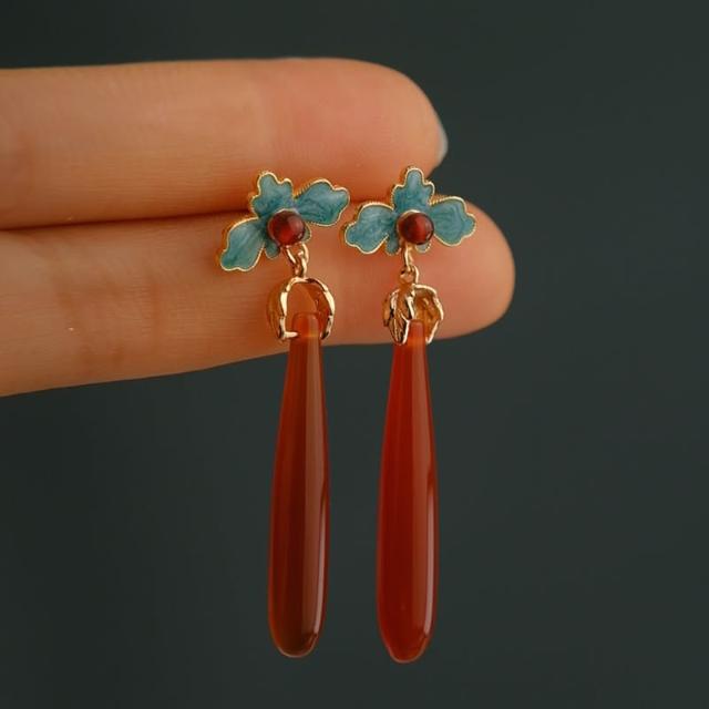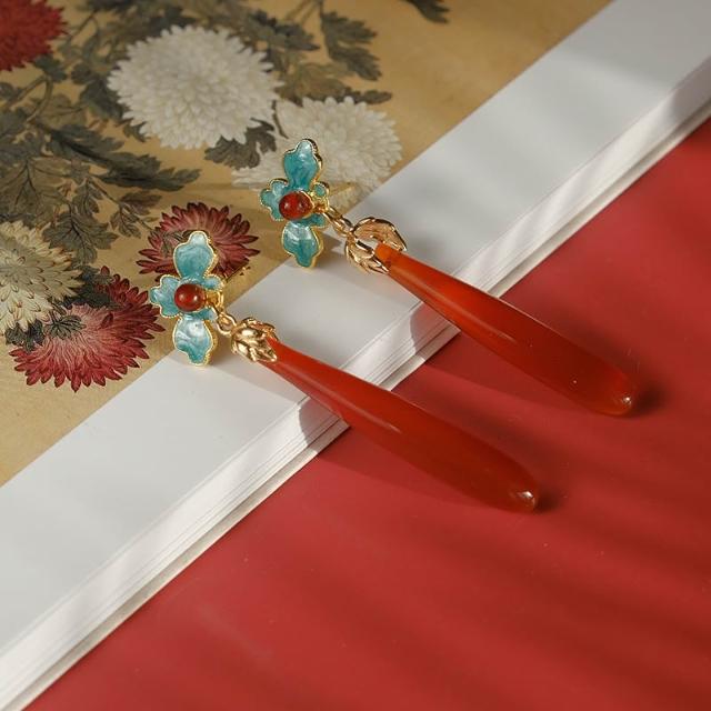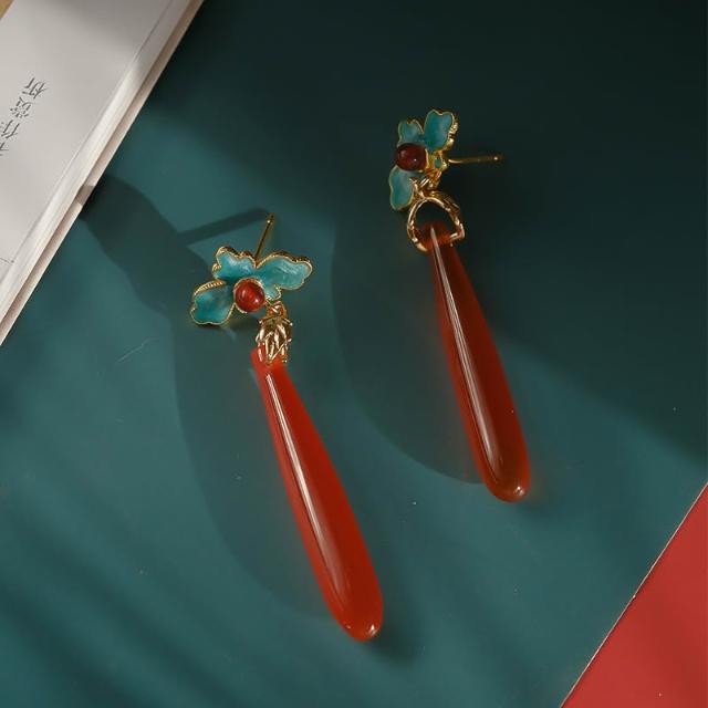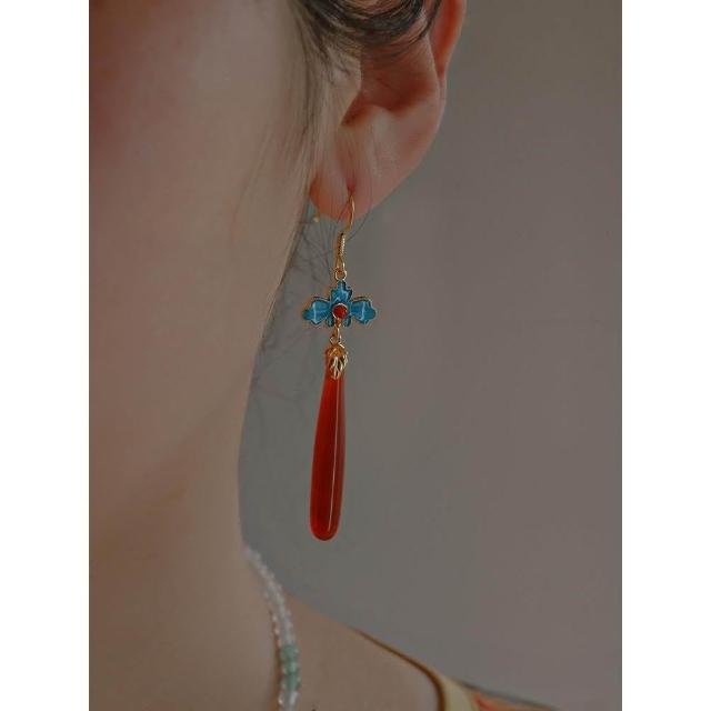 🎗飾間首飾鋪 新中式國風紅瑪瑙長水滴仿點翠燒藍耳環漢服旗袍耳環飾耳墜