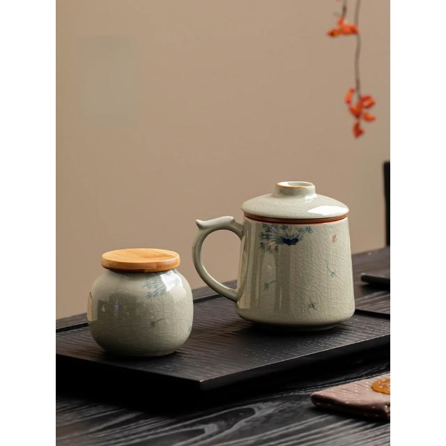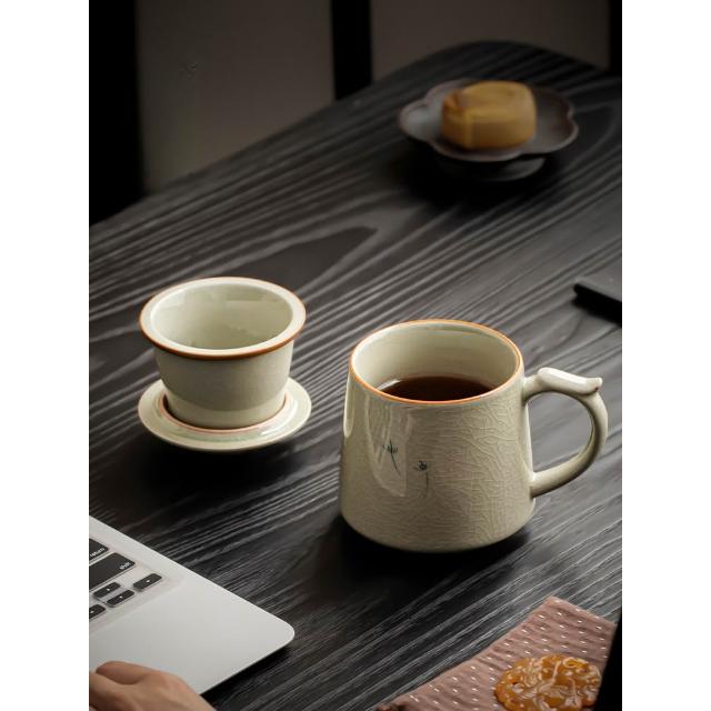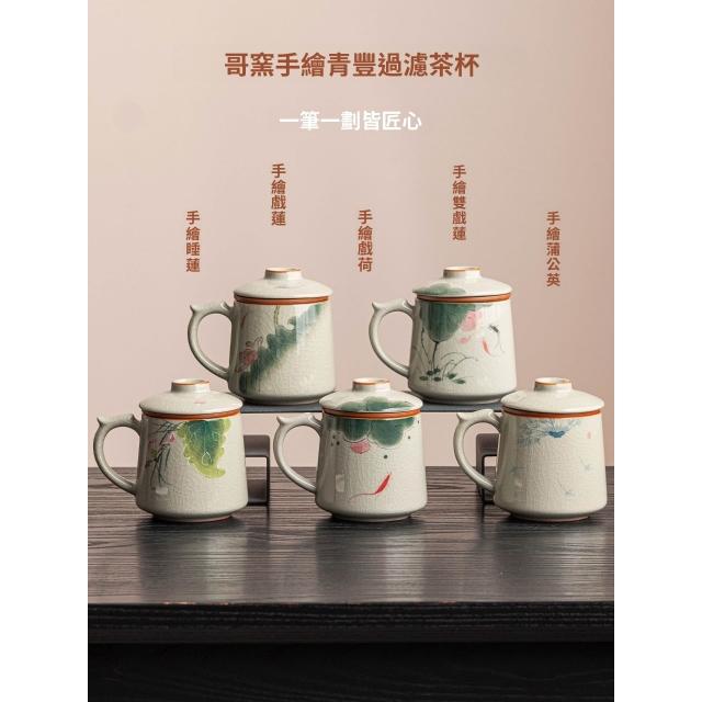 拾光良品 哥窑手繪茶杯陶瓷茶水分離杯辦公室過濾泡茶杯水杯帶蓋杯子