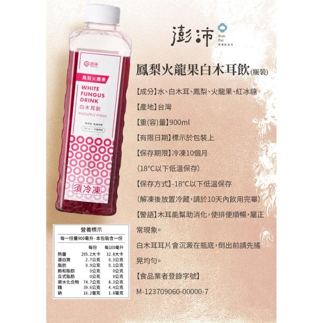 澎沛[白木耳系列] 鳳梨火龍果 單瓶裝 900ml|一道既美味又具營養價值的健康選擇。