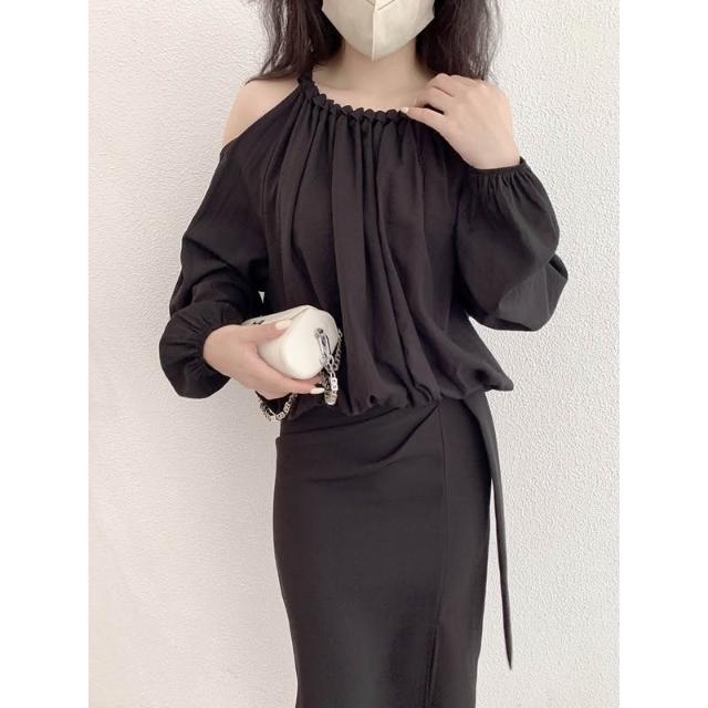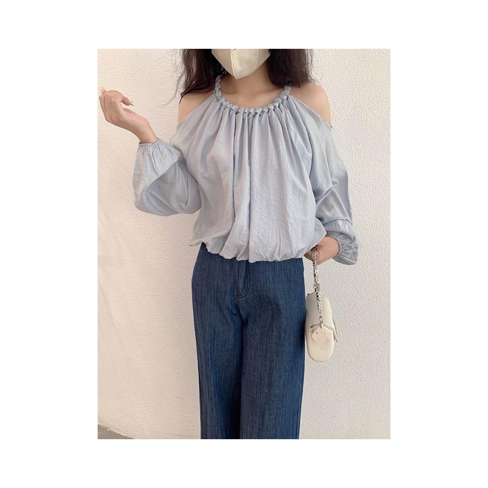 YAFFA_韓國氣質露肩削肩雪紡長袖襯衫上衣 圓領掛脖露肩長袖雪紡上衣 掛脖雪紡上衣 削肩掛脖長袖雪紡上衣 雪紡襯衫 小香風雪紡上衣