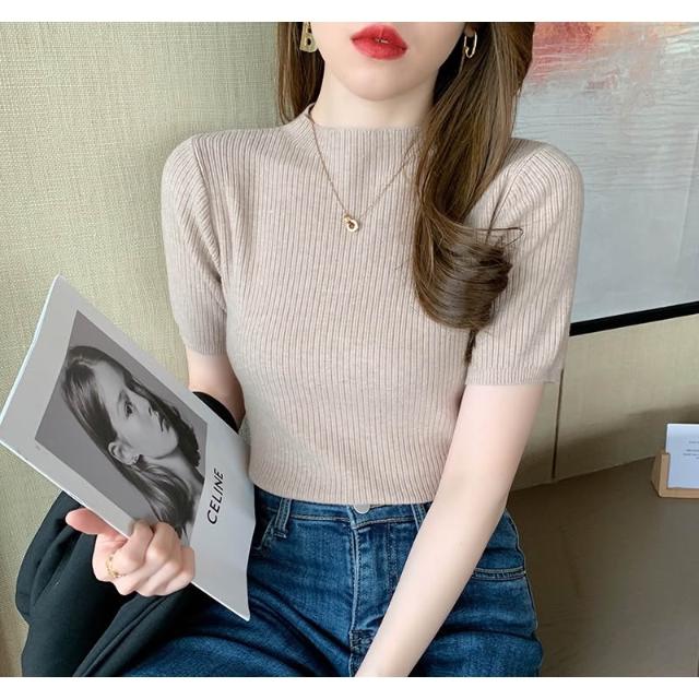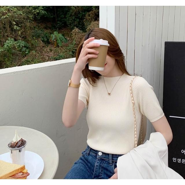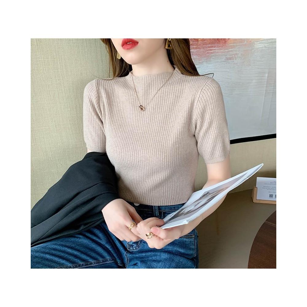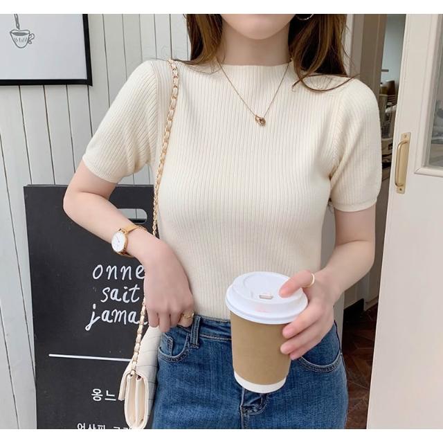YAFFA_韓國小領冰絲針織短袖T恤 小高領五分袖袖T恤 冰絲針織短袖上衣 小高領純色T恤 透氣短袖T恤 素色高領短T恤 半高領短T
