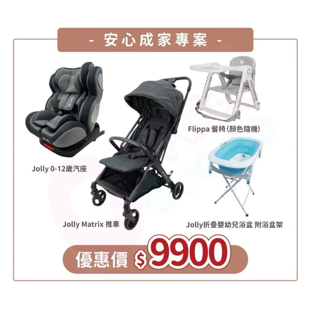 JOLLYJolly成家專案4件組Matrix自動收折嬰兒手推車/KidFix旋轉汽座0-12歲/Flippa餐椅/浴盆附浴盆架