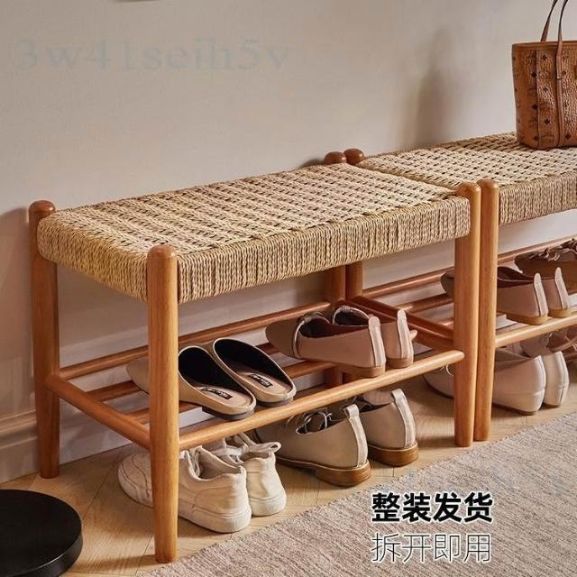 全實木換鞋凳 櫻桃木色進門穿鞋凳 矮凳 門口凳子 玄關鞋架 腳踏凳 北歐風儲物凳子 實木繩編換鞋凳