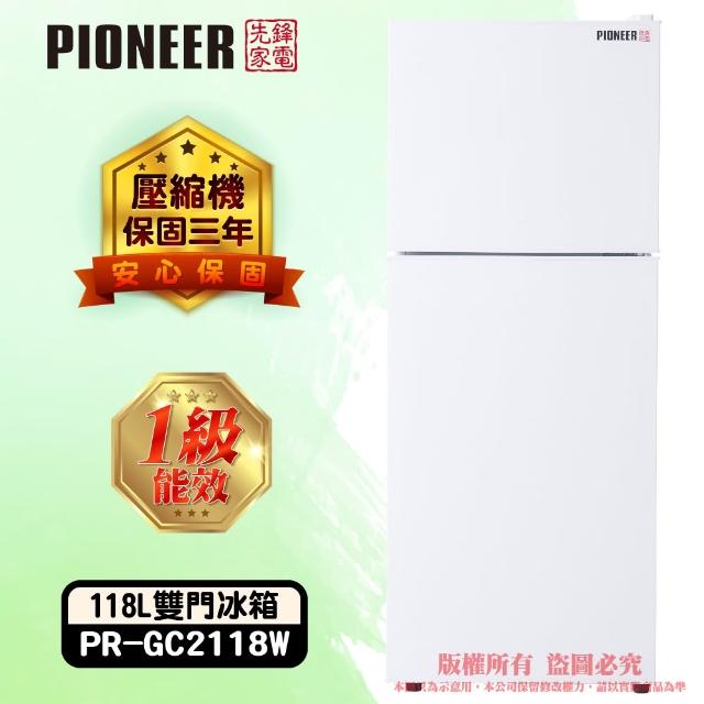 2026年度全新品上市 先鋒家電 118公升一級能效定頻右開雙門小冰箱 雪亮白/一鍵除霜(PR-GC2118W)