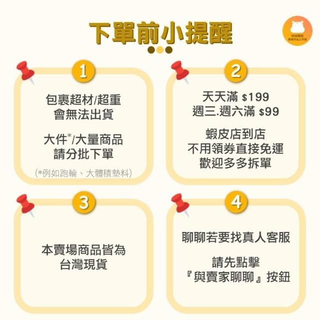 - 針對大型商品(包括:大型家電、家具床墊、健身按摩器材、車類...等),商店將於完成收款確認後,一天內〈不含例假日〉將會有專人與您確認相關配送細節等的聯繫。偏遠地區、樓層費及其它加價費用,皆由商店於約定配送時一併告知,商店將保留出貨與否的權利。