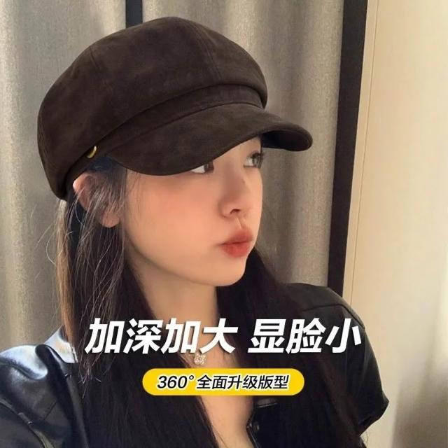 麂皮絨棕色八角貝雷帽女夏季大頭圍復古畫家報童帽短簷鴨舌帽大碼