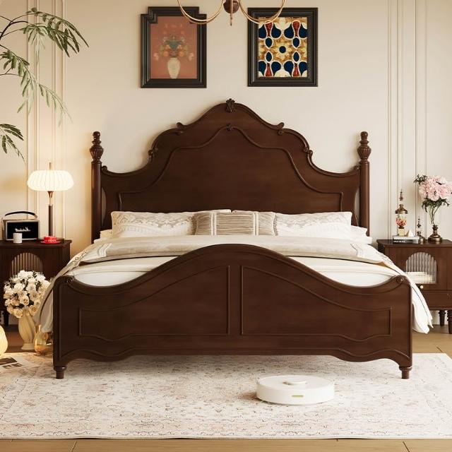美式復古床架帶床頭小戶型家用木床1米5胡桃色實木床加床墊單人床