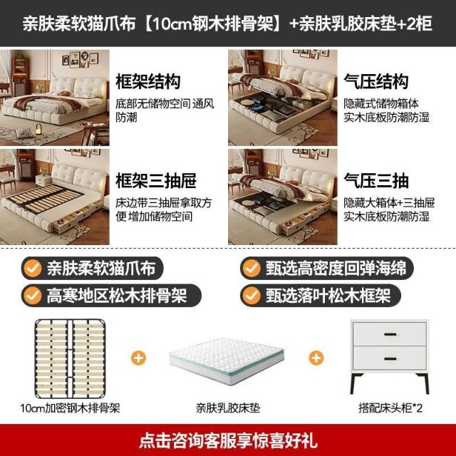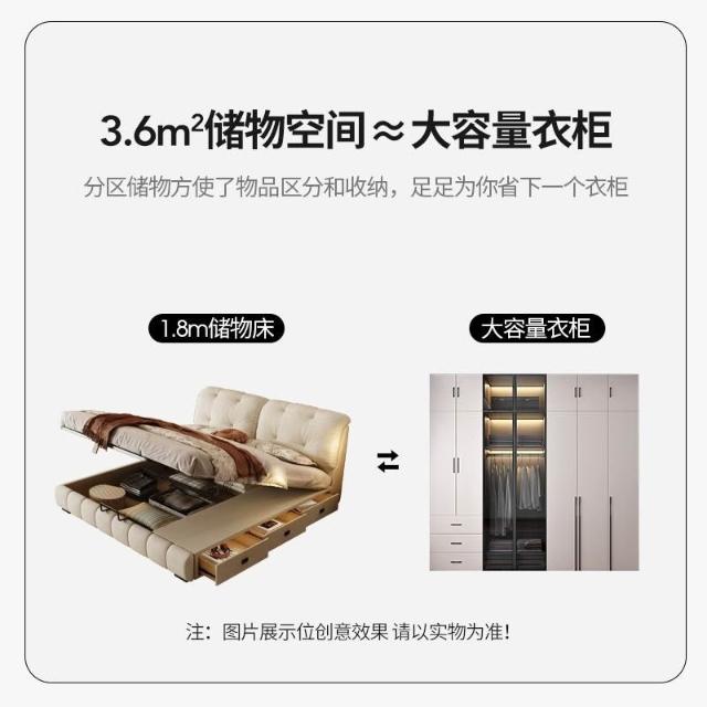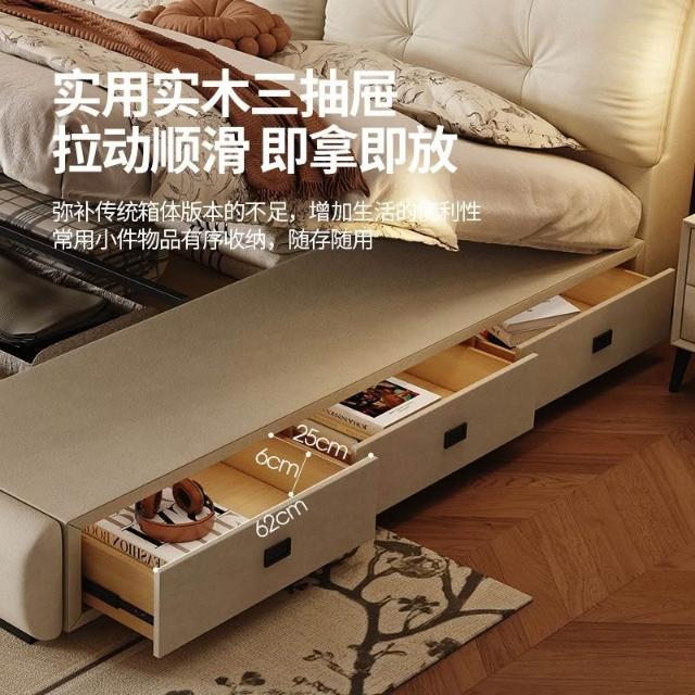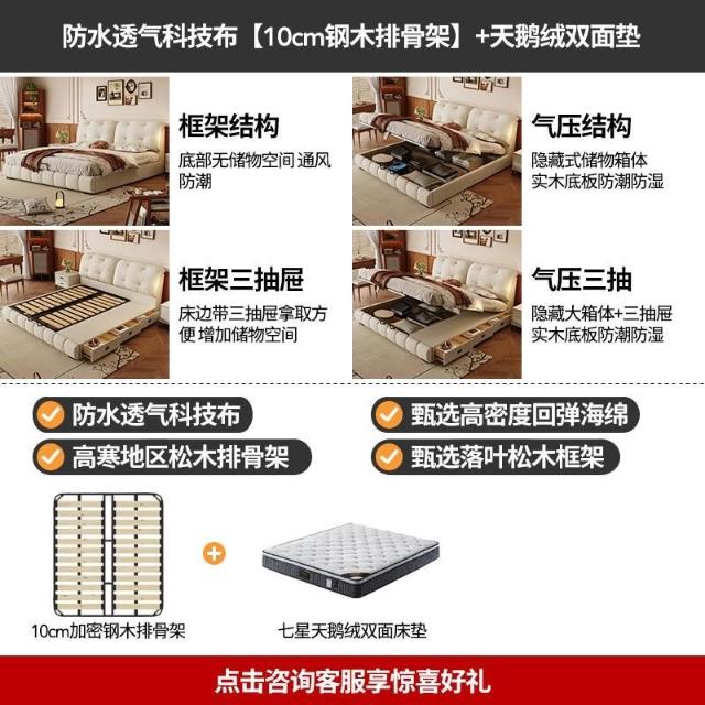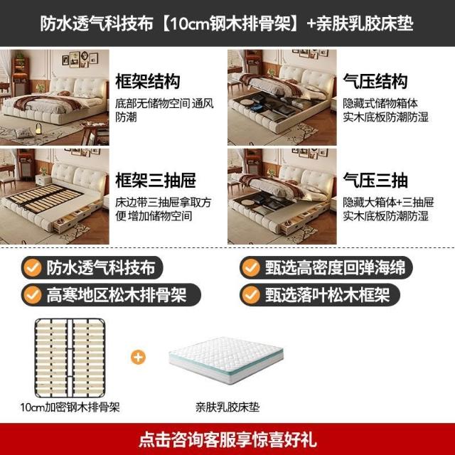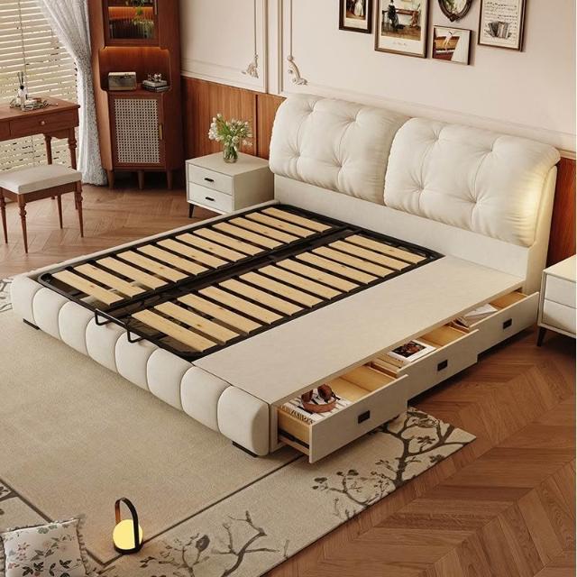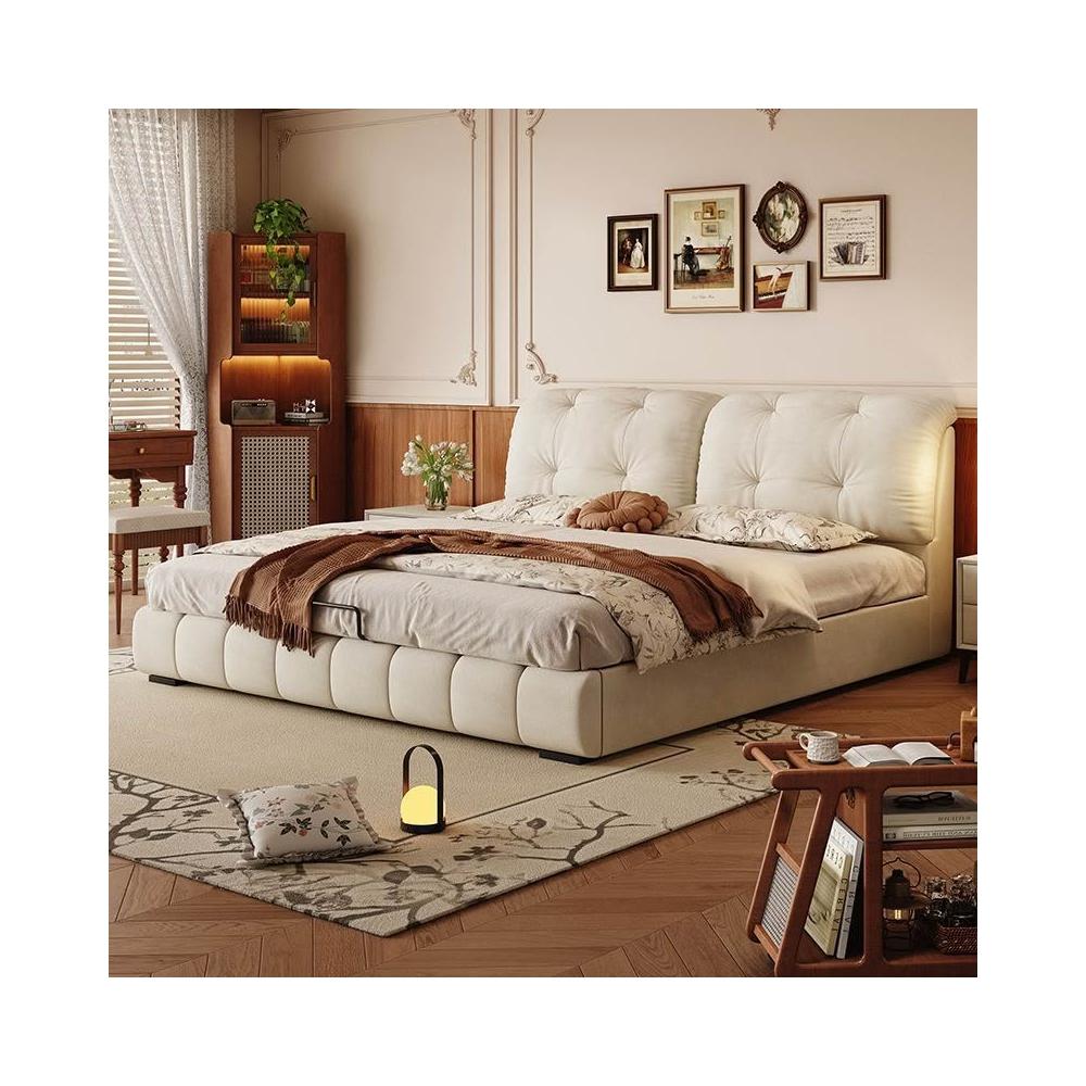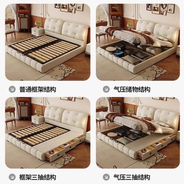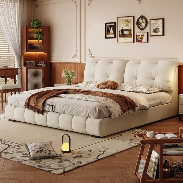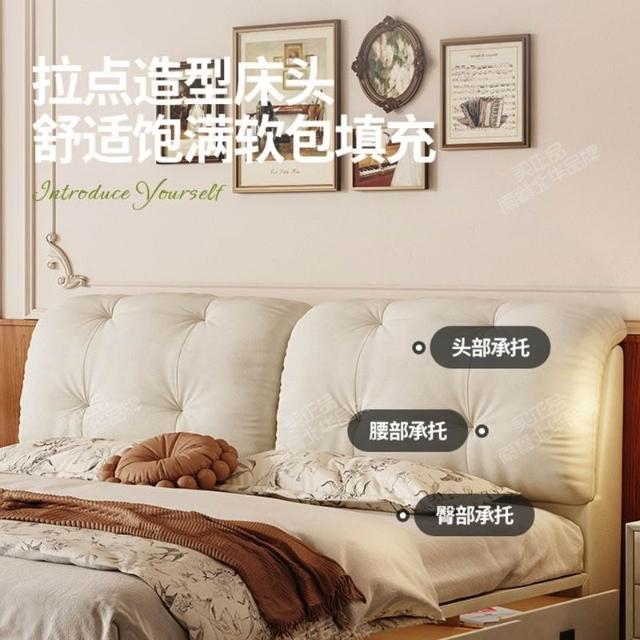 奶油風雲朵泡芙真皮床現代簡約主臥婚床雙人軟包儲物大床