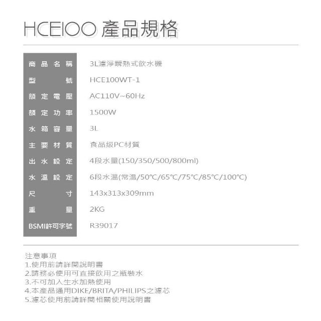 DIKEDIKE 3L濾淨瞬熱式飲水機 HCE100WT (含一芯)