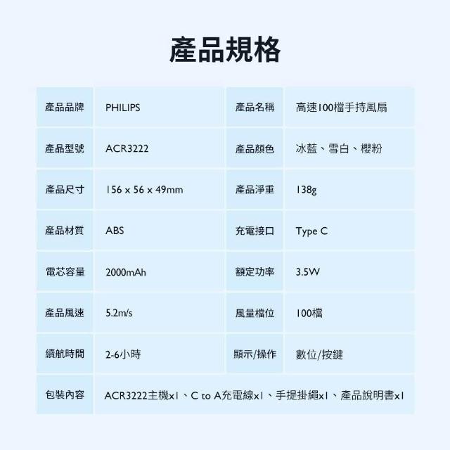 Philips 飛利浦PHILIPS ACR3222BPF 飛利浦 高速100檔手持風扇 風扇 涼風扇 冷風扇-清風藍