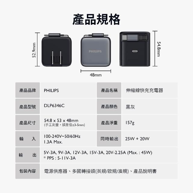 Philips 飛利浦PHILIPS DLP6346C 45W 自帶線充電器 70公分伸縮線 附萬國轉接頭 快充頭 充電器 豆腐頭 充電頭