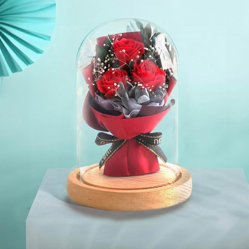 VENCEDOR玫瑰玻璃罩花束帶燈飾 一入 玫瑰花搭滿天星 永生花木質底座 送禮氣氛小夜燈