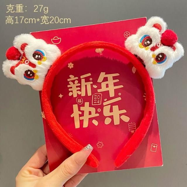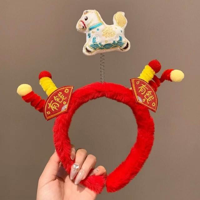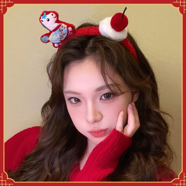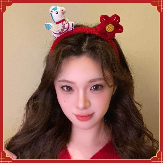(2個起購)新年紅色毛絨發箍可愛小馬福字頭飾拍照節日氛圍感發飾女款飾品