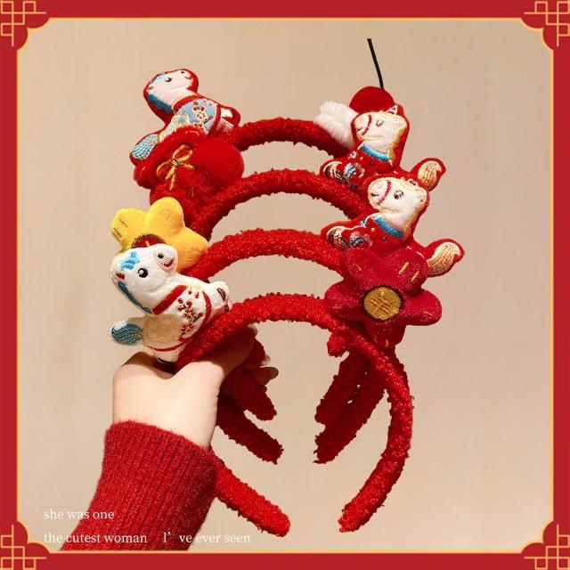 (2個起購)新年紅色毛絨發箍可愛小馬福字頭飾拍照節日氛圍感發飾女款飾品