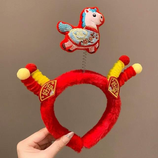 (2個起購)新年紅色毛絨發箍可愛小馬福字頭飾拍照節日氛圍感發飾女款飾品