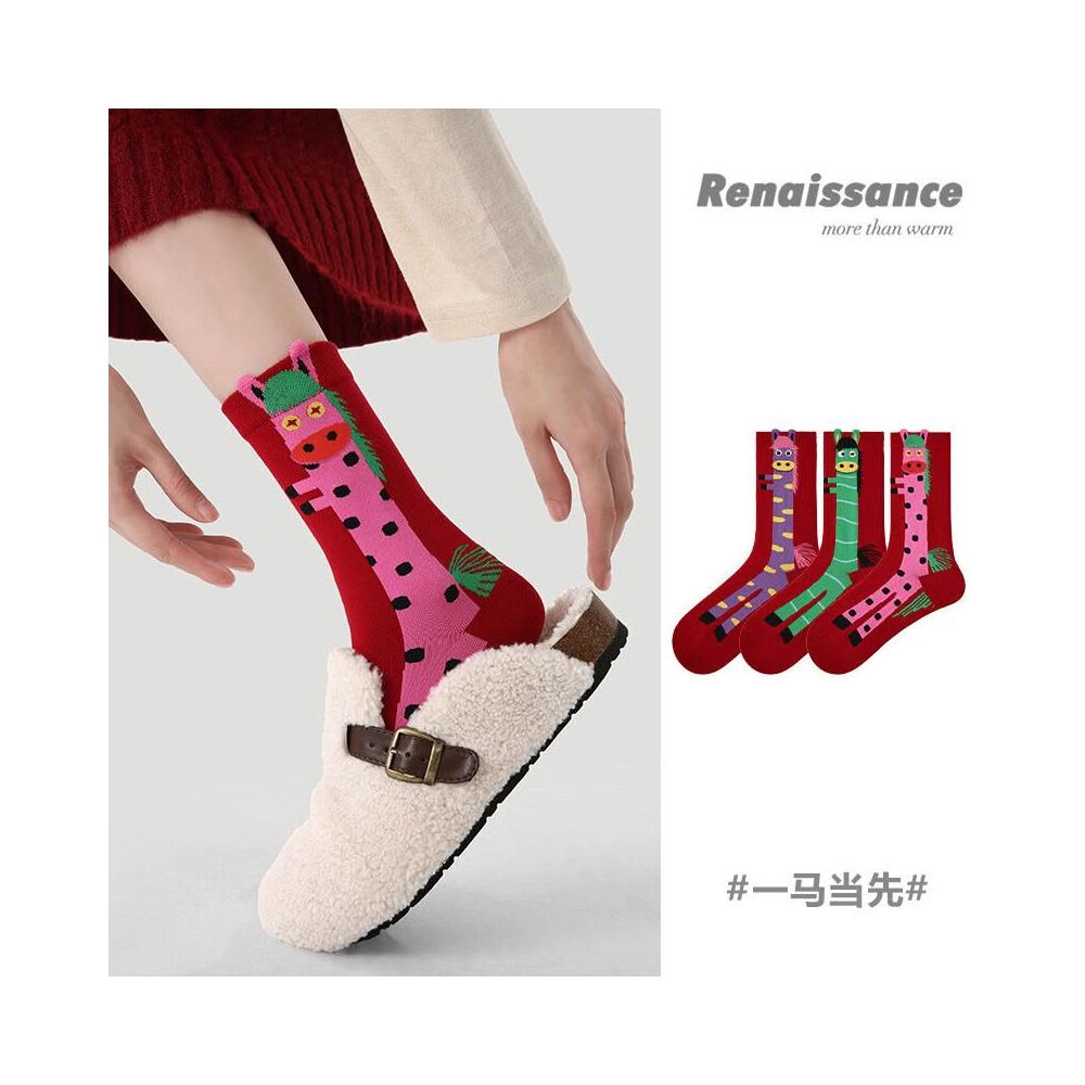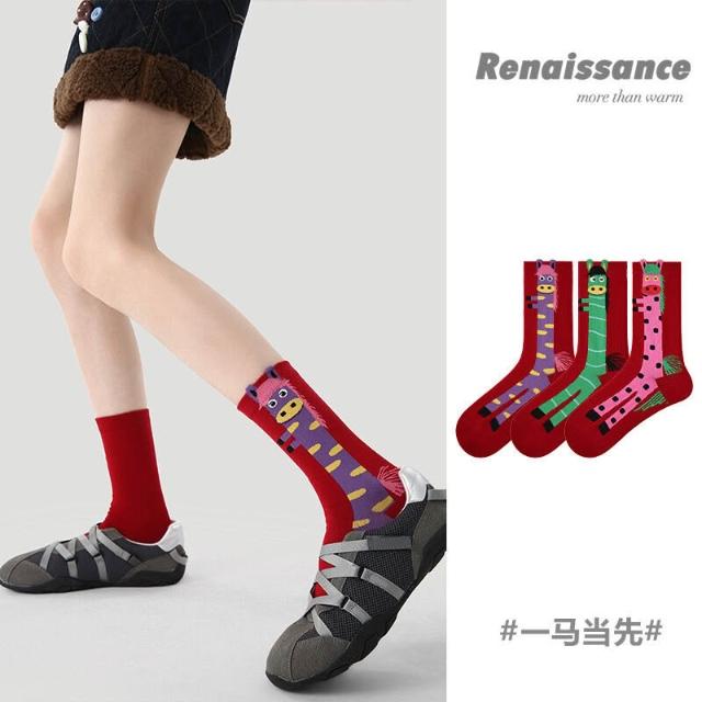 2026馬年本命年襪子女款秋冬中筒襪新年喜慶大紅襪3件装