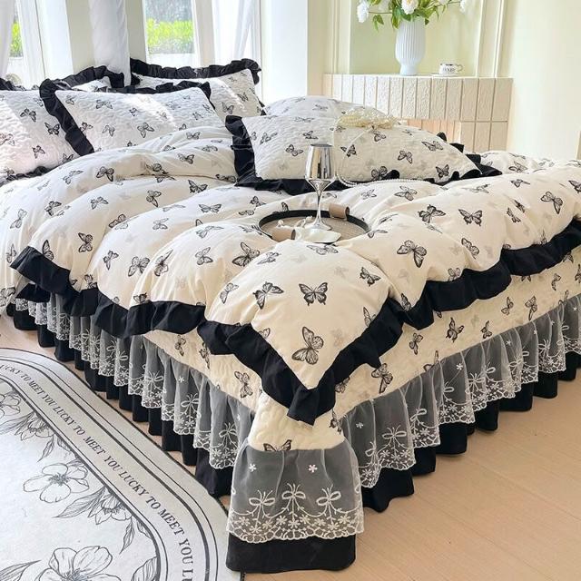 四季通用花邊被套水洗棉四件套夾棉床蓋復古赫本風可機洗床上套件