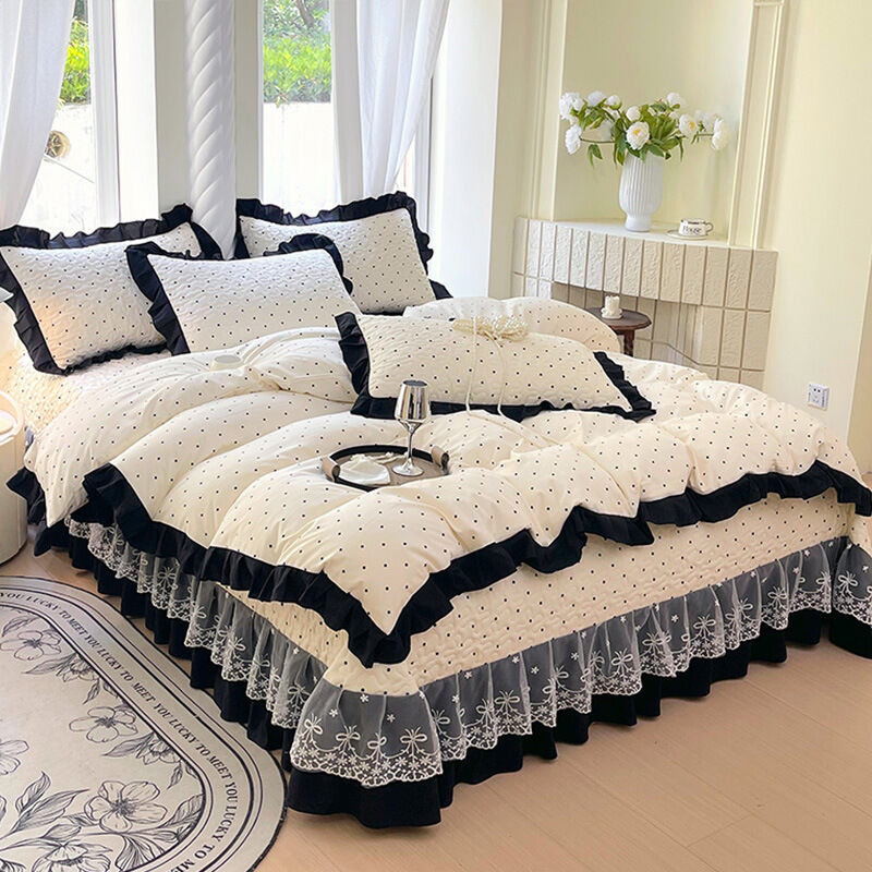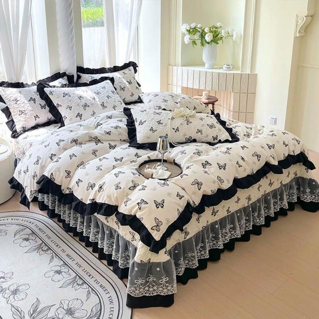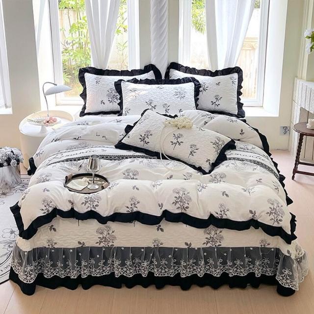 四季通用花邊被套水洗棉四件套夾棉床蓋復古赫本風可機洗床上套件