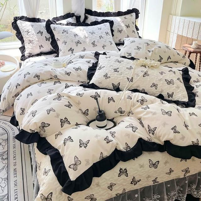 四季通用花邊被套水洗棉四件套夾棉床蓋復古赫本風可機洗床上套件