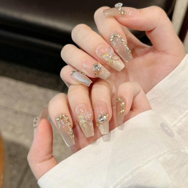 瑞卡曼枯葉蝶純手工穿戴甲氣質香槟法式貓眼輕奢高級美甲假指甲批