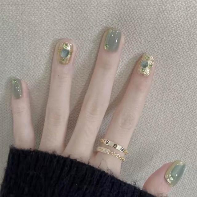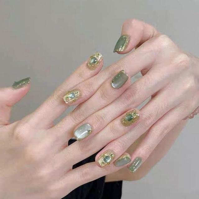 綠色布契拉提葡萄綠鉆法式純手工穿戴甲美甲片高級氣質