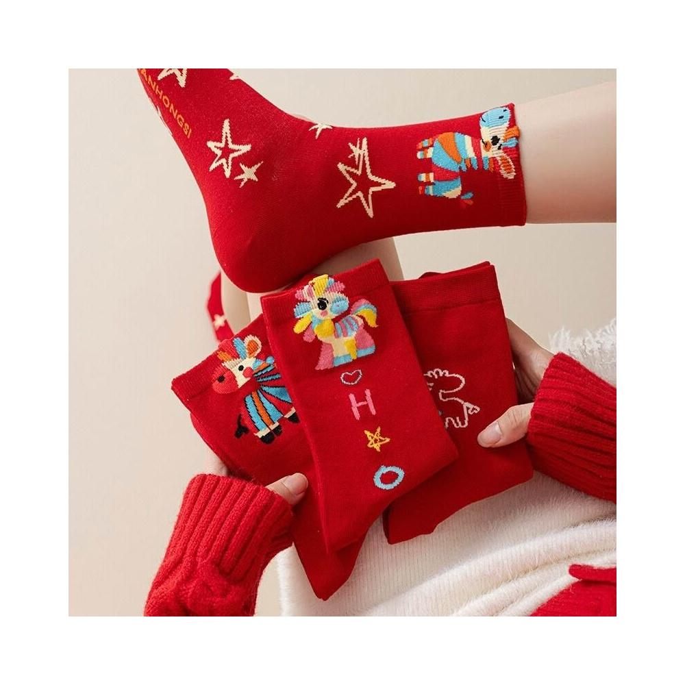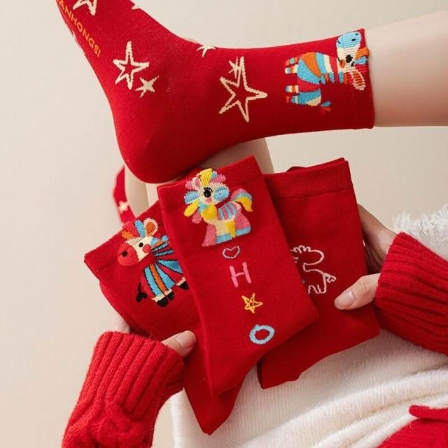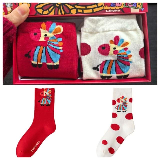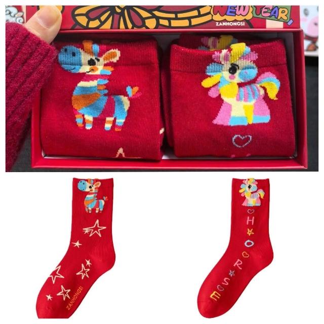 2026馬年本命年純棉紅襪子男女中筒襪可愛卡通彩虹馬ins潮新年襪