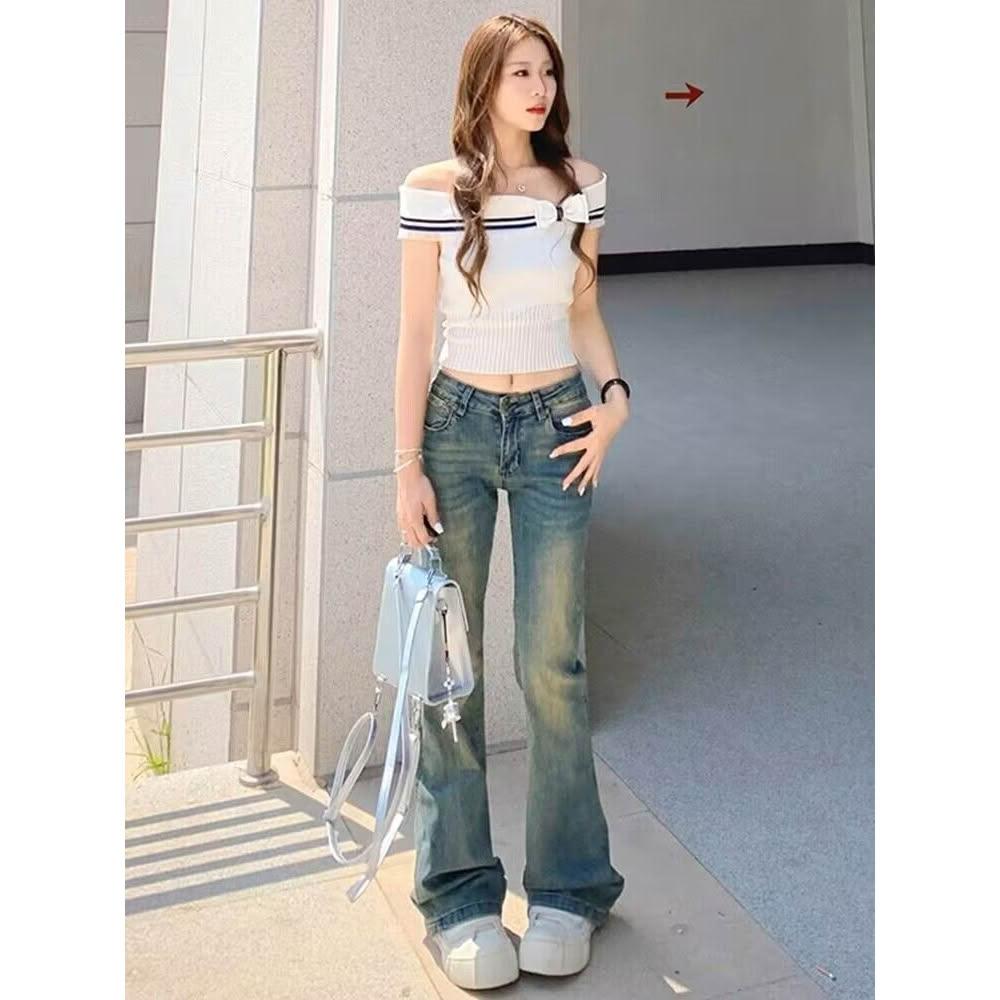 美式 辣妹 復古 包臀 低腰褲 水洗 做舊 長腿 微喇褲 顯瘦 修身 牛仔褲 女生衣服 緊身 辣妹(#女裝 #韓版 #休閒 #牛仔褲 #長褲)